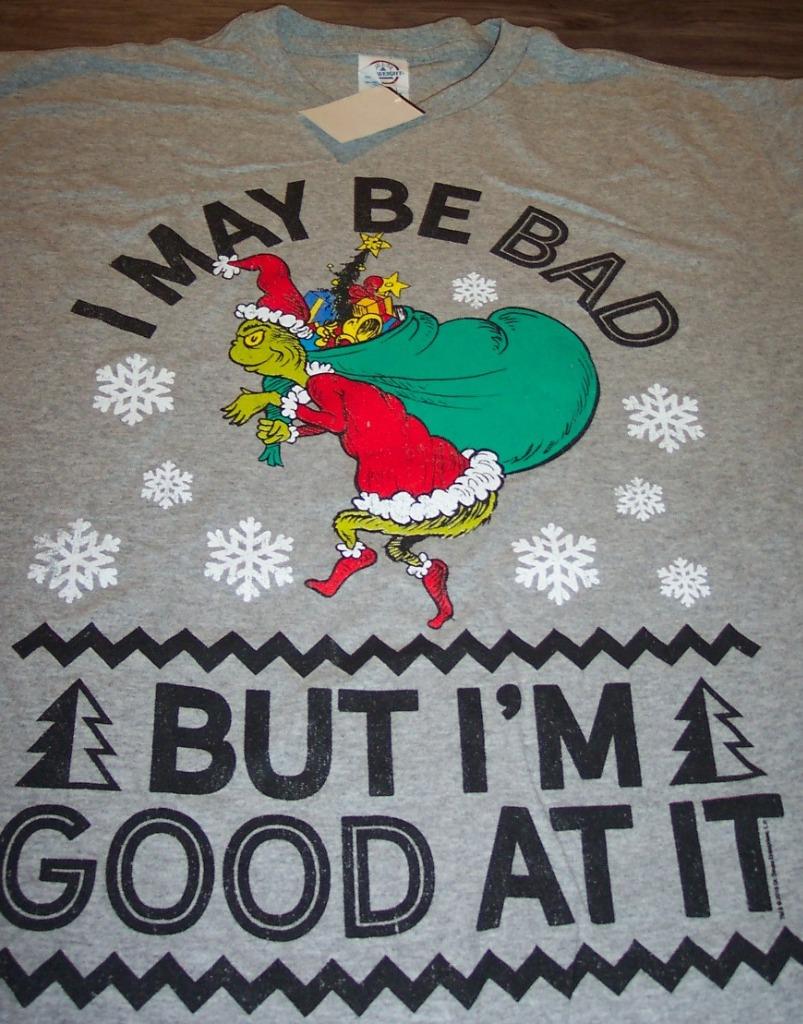 This is a FUNNY Dr. Seuss THE GRINCH WHO STOLE CHRISTMAS "I MAY BE BAD, BUT I'M GOOD AT IT" T-shirt. It is a size MEDIUM, and it is NEW with the tag. It is 20 inches from armpit to armpit and 30 inches in length. The Print is made to look vintage. Combine auctions to save on shipping. D3AG