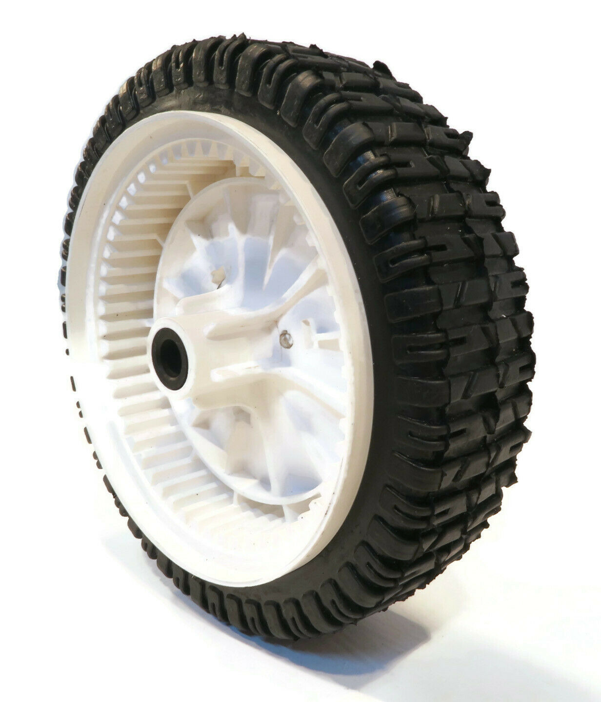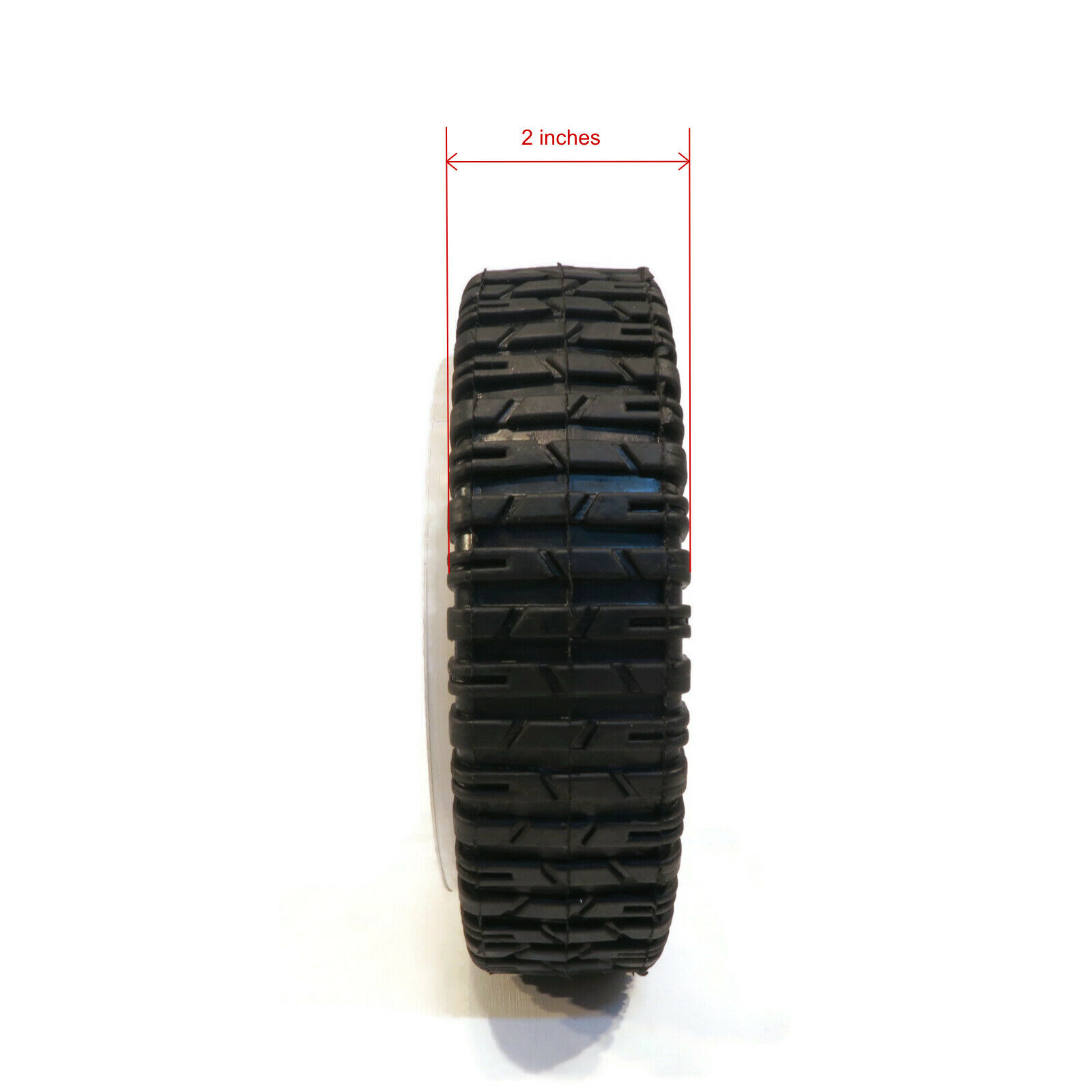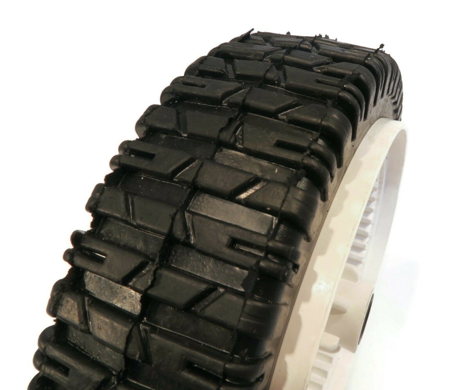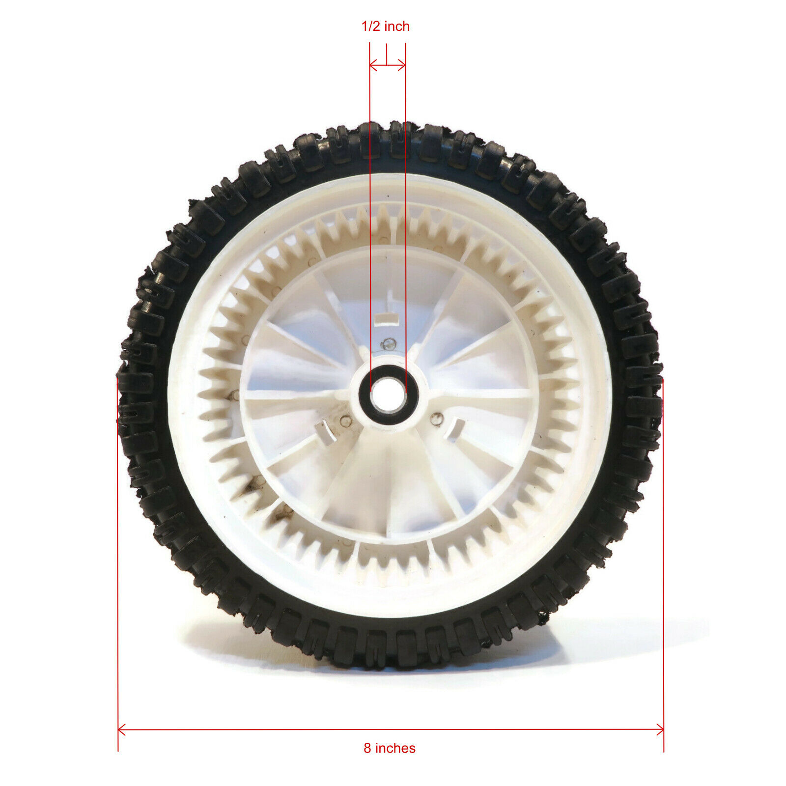 • Specs - Wheel Size: 8" x 2". Bore Size (Inner Diameter): 1/2". Hub Offset: 1 5/8". Tread Type: Gear. 53 Teeth. Material: Plastic. Refer to images 2 & 3 for more information