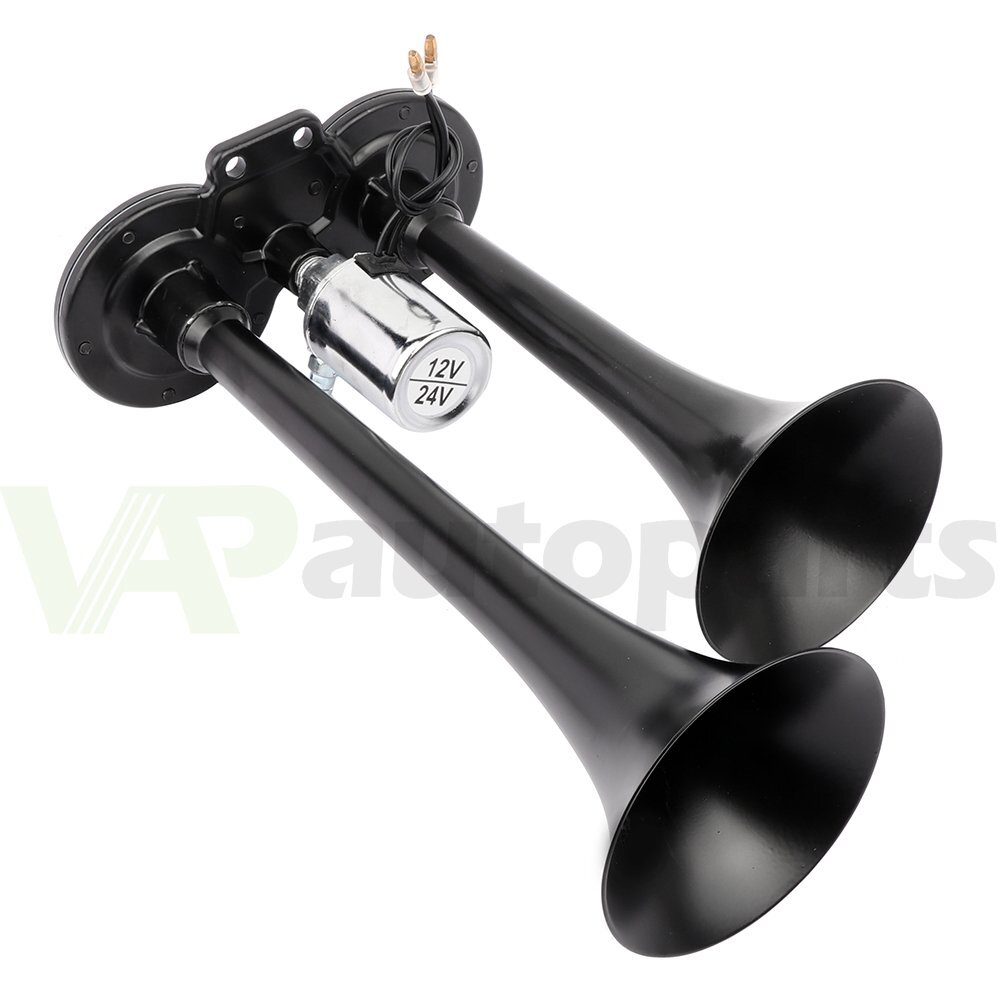 This powerful dual trumpet air horn produces a loud roaring sound. black look, trumpets are made entirely of stainless steel material with a bright polished finish that will not rust for maximum protection against all weather conditions. Horn comes with a heavy duty 12V solenoid and mounting hardware. An on-board air system is required for operation. Ideal for all vehicles with a 12V system. This horn is sure to draw all the attention you are looking for.