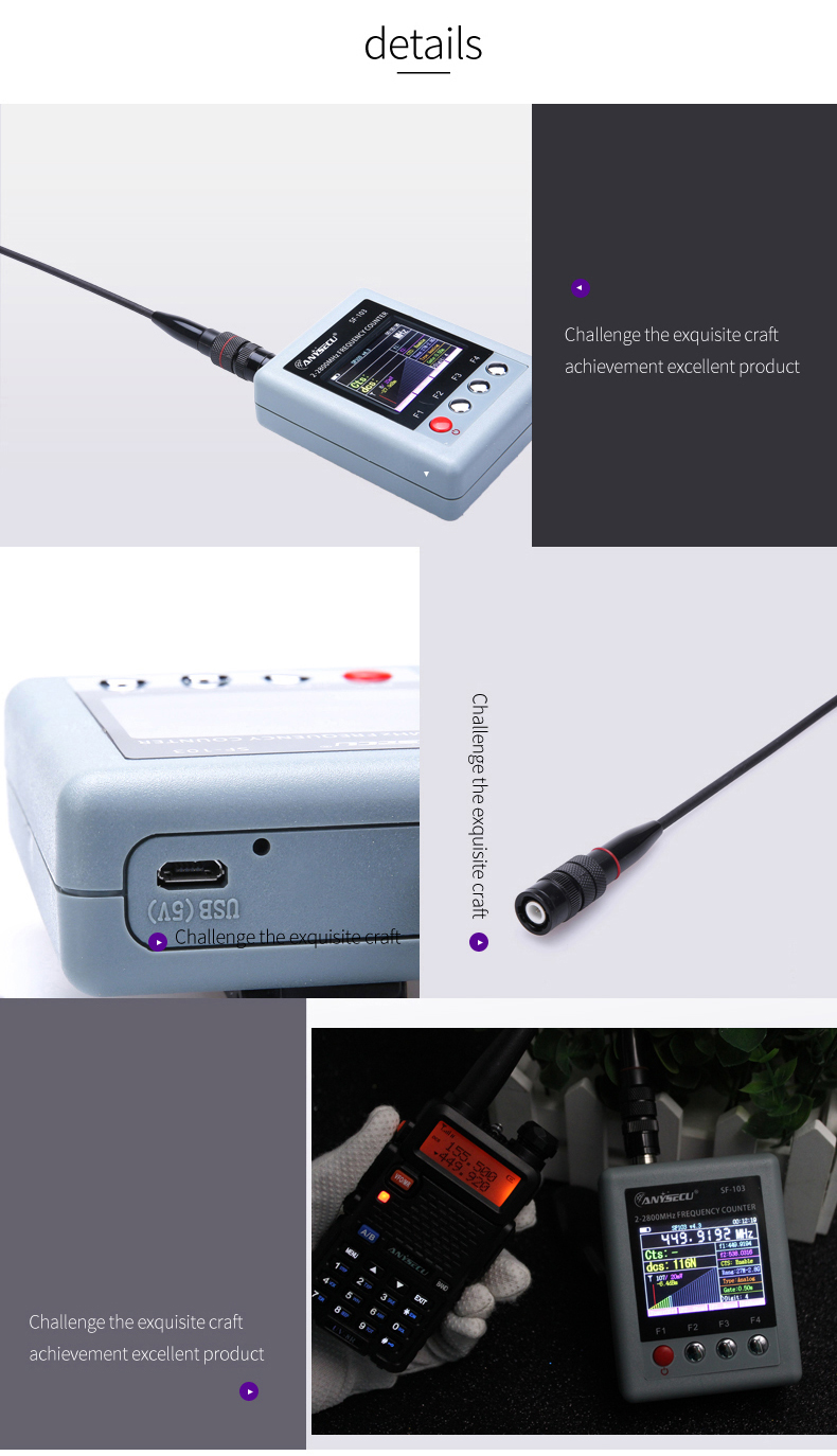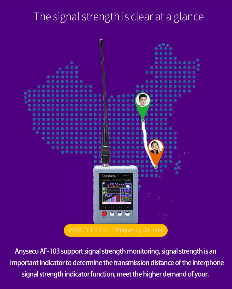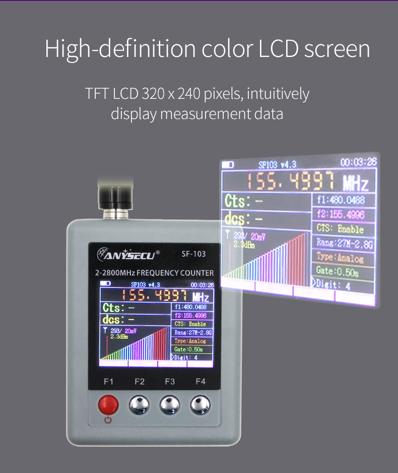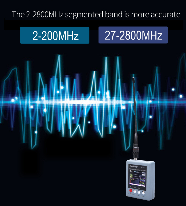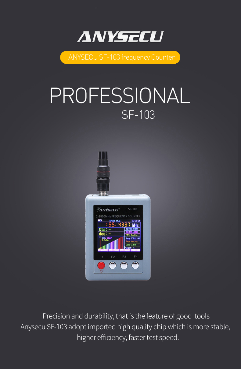 SF103 Support test frequency from 2MHz-200MHz / 27MHz -2800MHz ,capable of measuring the parameters of the frequency of the continuous carrier signal walkie-talkies , with signal strength indicator. CTCSS/DCS testable for 144/430MHz,DMR Digital Signal Testable.