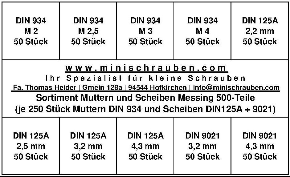 Sortiment mit 500 Stück Muttern und Scheiben aus Messing