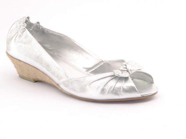 Metallic finish silver leather upper featuring a bow accent on the vamp.Leather lining.Cushioned leather insole.Elasticized heel band for a secure and perfect fit.Round peep toe design.Natural non-slip rubber outsole.