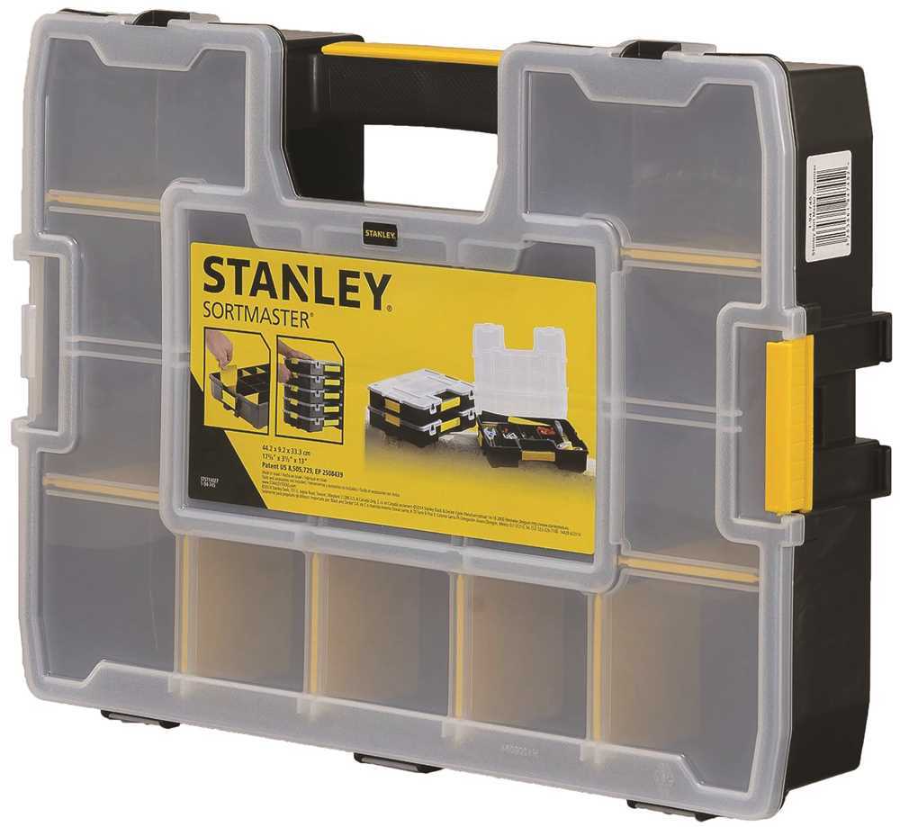 STANLEY SortMaster Organizer is a single organizing unit that features new side latches locks which allow the user to securely stack multiple organizers together. This allows transport of two units at once. The SortMaster offers removable dividers that provide high customization for small parts and larger hand tools, which allows for up to 1024 different configurations.
