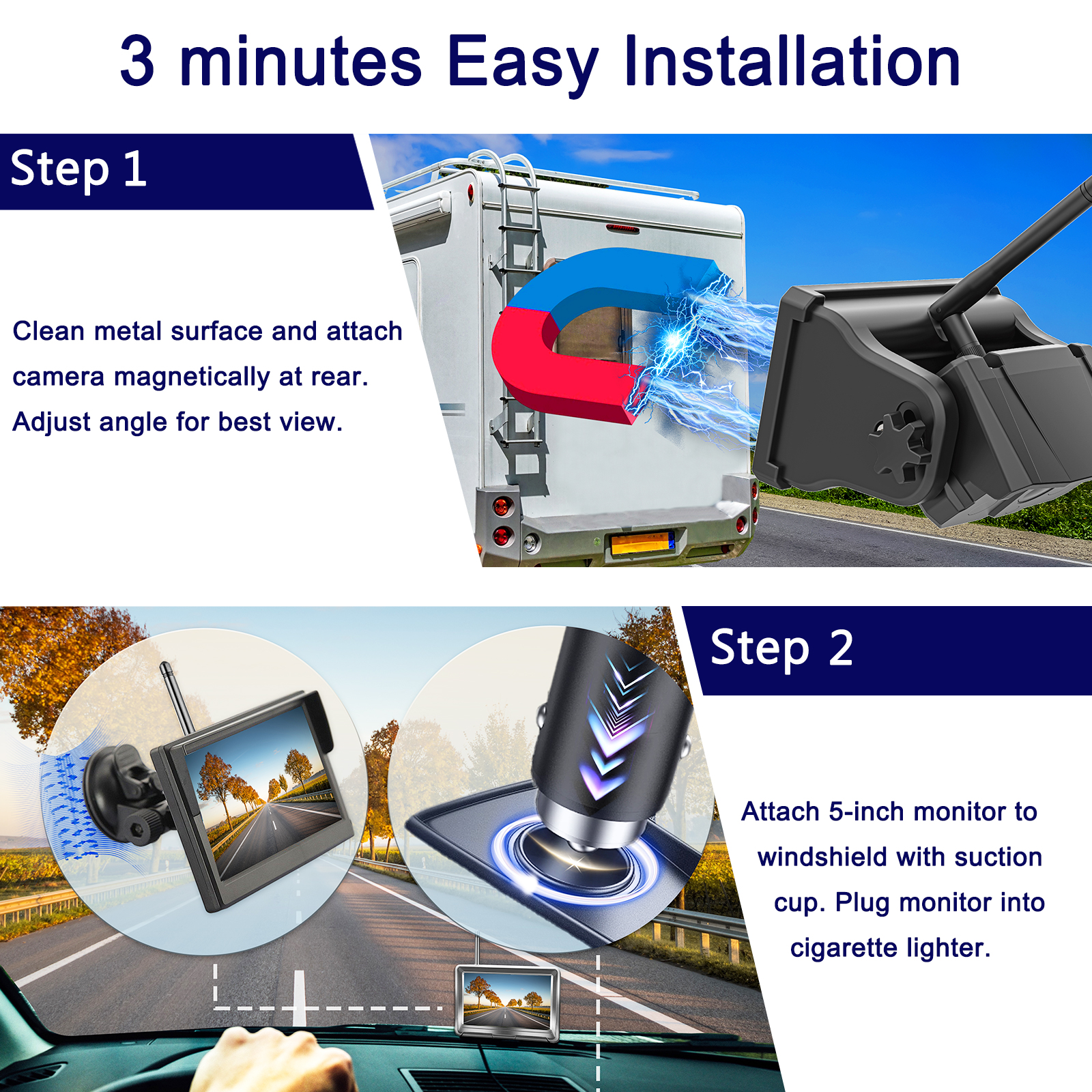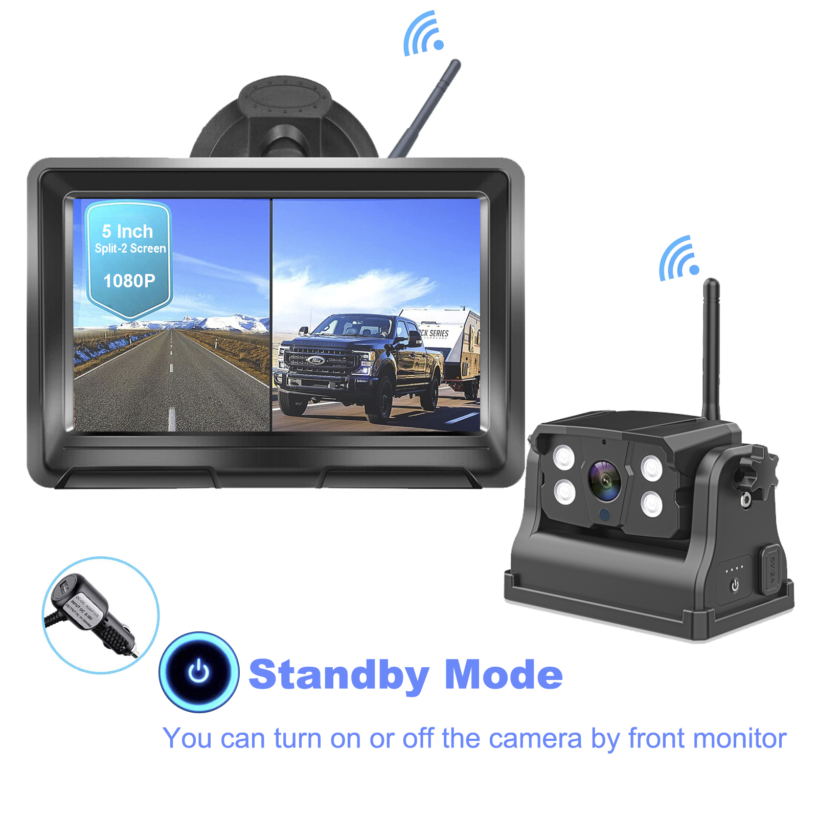 iPoster Digital Wireless Portable 2CH 5" Dual Screen Monitor with Standby Mode, You can turn on or off the cameras by front monitor, it will save the power volume, it can make you use it longer time +1080P Magnetic Base Trailer Hitch Rear View Backup Camera with 9600mA Rechargeable Long Life Battery Powered Wireless Backup Rear View Portable for Easy Hooking Horse Gooseneck/Rv/5th Wheels/Boats/Truck/Bus