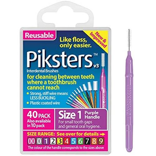 Interdental brushes are like mini toothbrushes that get into the tiny spaces between teeth and clean effectively right down to the gum line. They are excellent for around the back teeth because they can get into areas your toothbrush and floss cannot reach. Piksters are available in Woolworths and Coles in sizes 1, 3 and 5 and most leading pharmacies stock the whole range.