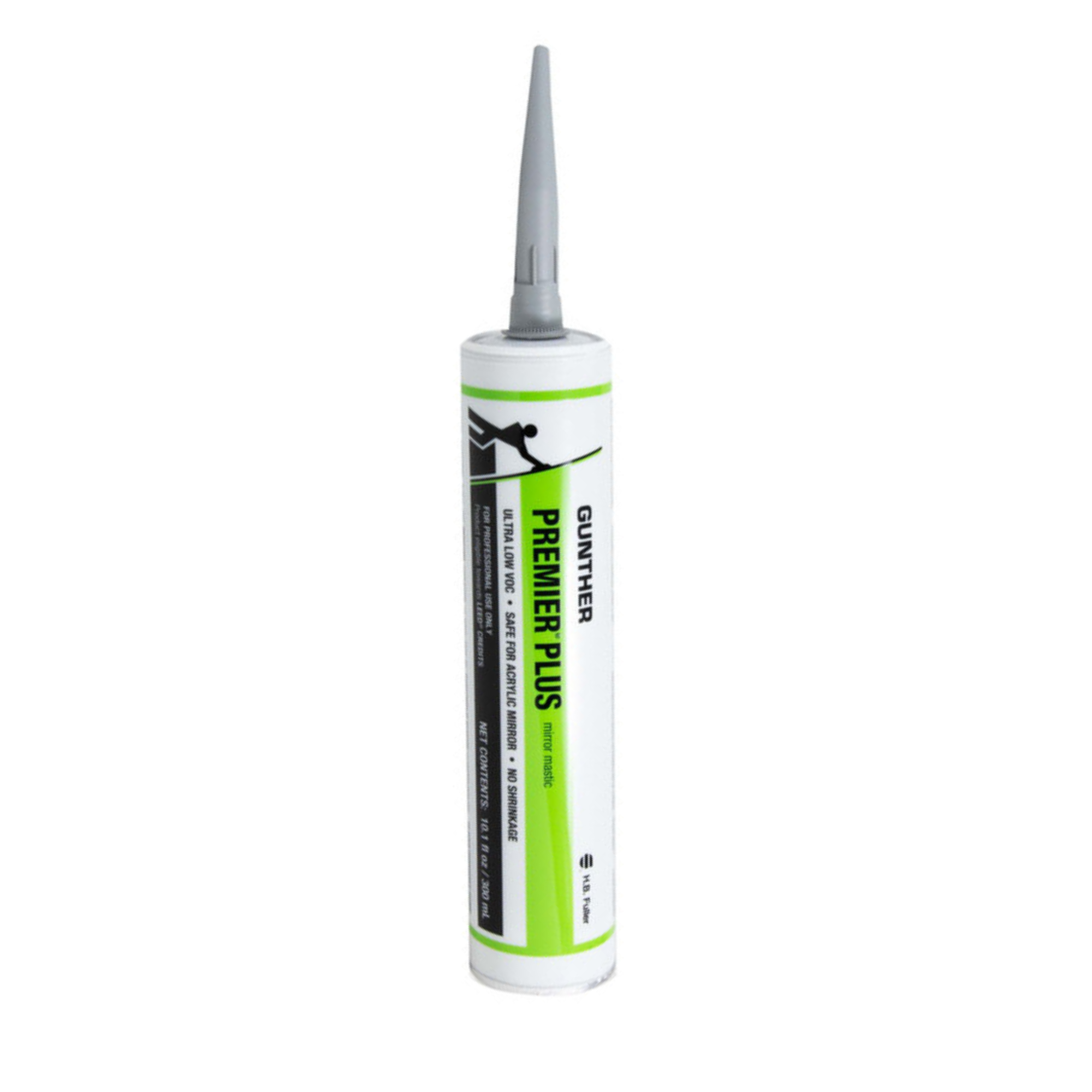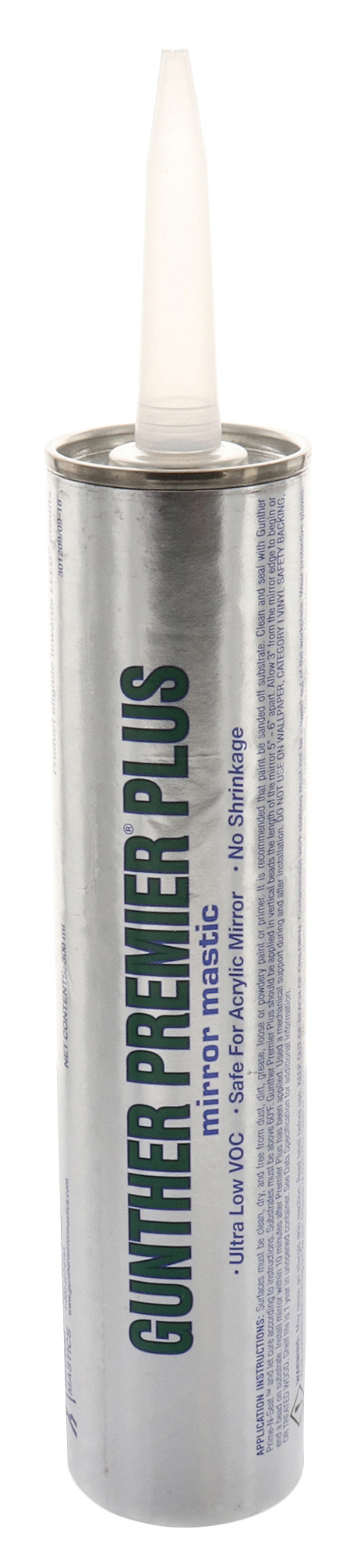 Gunther Premier Plus Mirror Mastic is a high quality adhesive formulated to create a fast permanent bond between glass and mirror surfaces while remaining flexible after curing. It bonds to both porous and non-porous substrates and can be built out to 2 inches (51 mm) for large mirror installations or uneven wall surfaces. The adhesive can also compress to 1/16 inch (1.6 mm) for applications requiring close tolerances such as mirrored furniture or medicine cabinets. Designed for versatility, it does not shrink or become brittle over time and is suitable for use in high-traffic environments including gyms, dance studios, and commercial installations. The formulation withstands exposure to UV light and qualifies for LEED Green Building Rating System credit. For best results, 3/8 inch (9.5 mm) vertical beads should be applied 6 inches (127 to 152 mm) away from the edge of a clean and dry surface to prevent squeeze-out. The product features an ultra low VOC level of 10 g/l and is supplied in a 10.3 fluid ounce plastic tube.