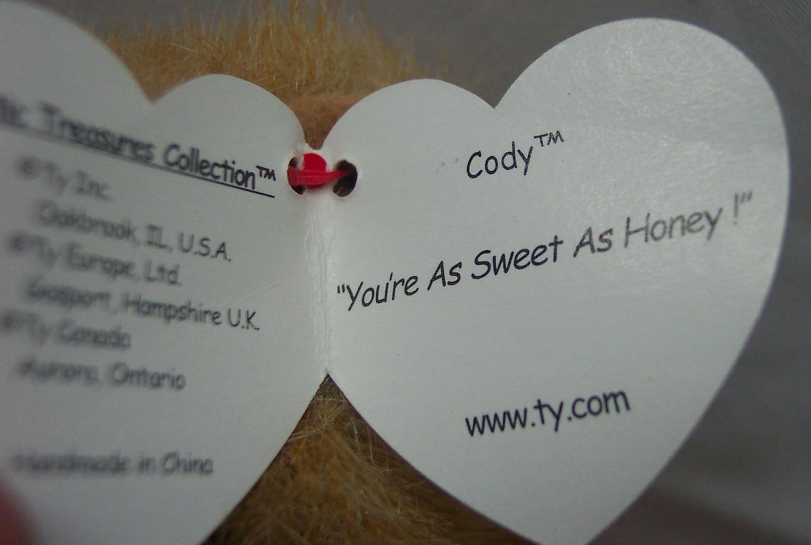 This is a Beanie Baby Attic Treasures CODY TEDDY BEAR Stuffed Animal Toy. Made by TY in 1993. It is 8 inches tall and it is NEW with the tag. It is CLEAN, No tears, stains or defects. It is fully jointed. Combine auctions to save on shipping. EAG