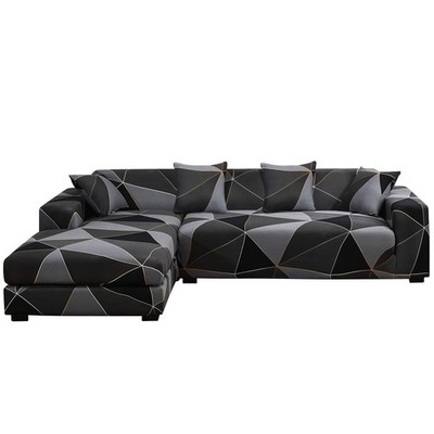 MIFXIN Sectional Sofa Cover 2 Piece Stretch 3 Seat L Shape Couch Slipcovers Elastic Printed Sectional Sofa Furniture Protector for Living Room with 4pcs Pillow Covers (Black Gray)
