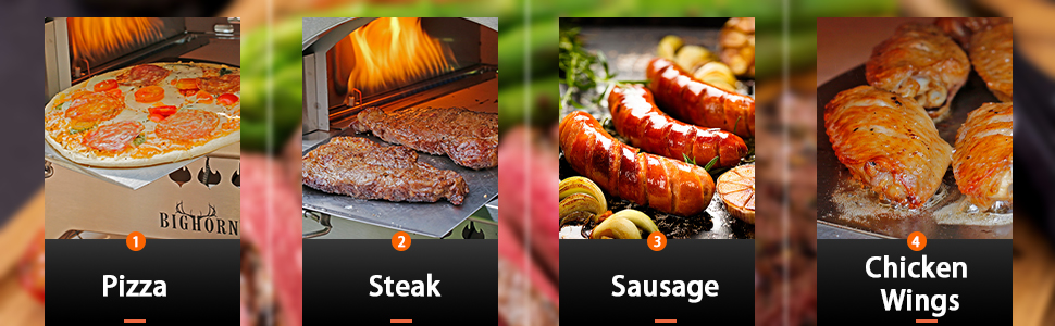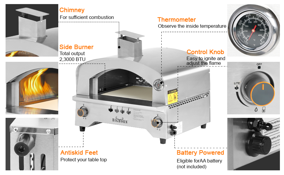 WHAT IS INCLUDE - This gas pizza oven will come with a foldable pizza peel which can be put inside the propane pizza oven when not in use, a 13 inch pizza stone which absorbs moisture & has superior heat retention, great for cooking fresh or frozen pizza, and a 5 feet propane regulator hose for many occasions like barbecue party, camping or catering event