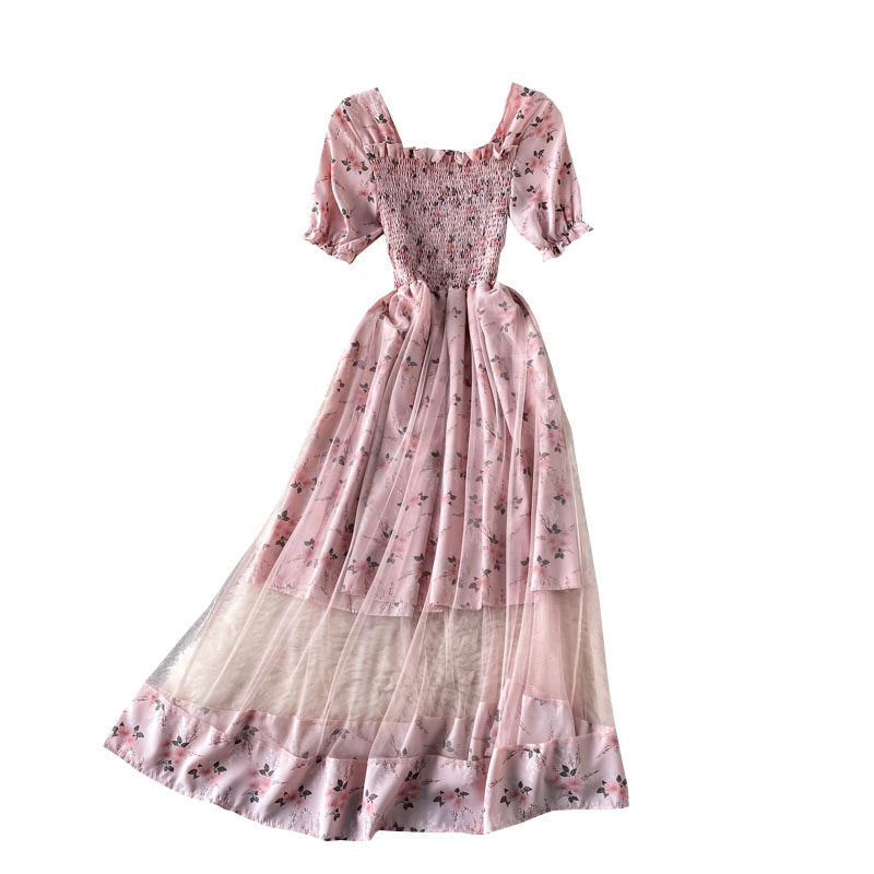Tea Dress Midi Floral Chiffon Mesh Short Sleeve Ruffle Square Neck Fitted Casual