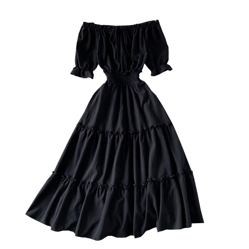 Lady Dress Off-shoulder Ruffle Short Puff Sleeves Midi A-line Casual Retro Fairy