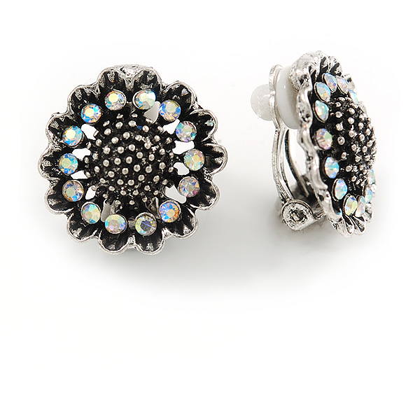 Complete your outfits in pure glamour with these Vintage Inspired AB Crystal Sunflower Floral Clip On Earrings In Aged Silver Tone.