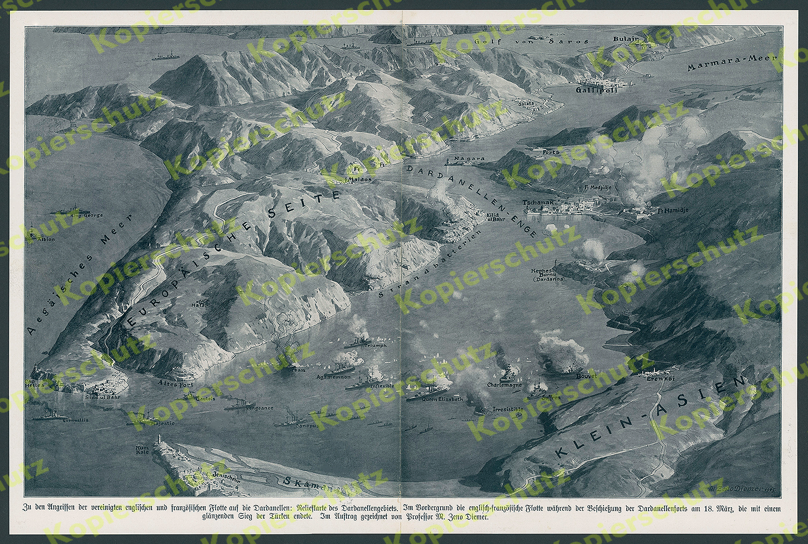 Zu Rückgabe und AGB bitte mich-Seite beachten. Die dort hinterlegten Informationen sind verbindlicher Bestandteil dieses Angebots/dieser Artikelbeschreibung!1. Weltkrieg, 1. WK, 1.WK, 10th Turkish Division, 1915, 1st World War, 20. Jahrhundert, Aegäisches Meer, Ägäis, Agamemnon, Akademische Kunst, Akademische Malerei, Albion, Altdeutschland, Altes Fort, Altmeisterlichkeit, Ansichten, Arab world, Araber, Arabien, arabisch, Arabische Halbinsel, Armee, Ars gratia artis, art history, Artillerie, Asien, Asienkorps, Außenpolitik, Bildnis, Bildniskunst, Blaujacken, Boot, Bordgeschütz, Bouvet, Bulair, Callipolis, Canopus, Cap Helles, Charlemagne, Cornwallis, cultural history, D-80333 München, D-82487 Oberammergau, Dampfschiffe, Dardanellen, Dardanellen- Enge, Dekorative Graphik, Der Europäische Krieg, Deutsche Geschichte, Deutsche Marine, deutsche Militärmission im Osmanischen Reich, Deutsche Orient-Mission, Deutsches Asien-Korps, Deutsches Kaiserreich, Deutsches Orient-Korps, Deutsches Reich, Deutschland, Deutsch-orientalische Beziehungen, Dschihad, Empire, England, Erenköi, Erster Weltkrieg, Europäische Seite, Feindfahrten, Flotte, Fort Hamidje, Fort Maidos, Fort Medjidje, Forts, Front, Fronteinsatz, Frontgeschehen, Galata, Gallipoli, Gallipolli, Gaulois, Gemälde, Genre, genre painting, Genremalerei, Geopolitik, German, German Empire, Germans, German-Turkish friendship, Germany, Geschichte, Geschichtsmalerei, Gewässer, Glaubenskrieg, Golf von Saros, Großbritannien, Große Zeit, Großkampfschiff, Halar, Halbinsel Gallipoli, Halbmond, Heer, Heereswesen, Heerwesen, Heiliger Krieg, Heiliger Oorlog, Heimat, Heimatkunde, Heimatverteidigung, Heimatwehr, Heldenkampf, Heldenleben, Heldentaten, Heldentum, Historically, Historienbilder, Historienmalerei, Historisch, Historische Bilder, History, Hochsee, Hochseeflotte, Imperial German Navy, Inflexible, Irresistible, Islam, Islamic, Jenischehr, Jihad, jihadization, Kaiserlich Deutsches Marineoffizierkorps, Kaiserliche Marine, Kaiserreich, Kaiserzeit, Kallipolis, Kephes-Burnu (Dardanos), Kilid ul Bahr, King George, Kleinasien, Klein-Asien, Kriegsbilder, Kriegs-Bilder, Kriegsflotte, Kriegsführung, Kriegsgebiet, Kriegsgeschichte, Kriegsjahr 1915, Kriegsland, Kriegsmaler, Kriegsmalerei, Kriegsmarine, Kriegsschauplatz, Kriegsschauplätze, Kriegsschiff, Kriegsschiffe, Kriegstechnik, Kriegswirtschaft, Kultur, Kulturgeschichte, Kum Kale, Kunst, Kunstgeschichte, Küste, Küstenschutz, Landeskunde, Landesverteidigung, Linienschiff, Majestic, Manövrieren, Marine, Marineeinheiten, Marinemaler, Marinemalerei, Marineoffizier, Marinetruppen, Maritim, Marmara-Meer, Matrosen, mediterranean sea, Militär, Militärgeschichte, Militaria, Militärmacht zur See, military, Mittelländisches Meer, Mittelmeer, Mohammedaner, Monarchie, Muslime, Muslims, Nagara, Naher Osten, Nautic, Nautik, naval, Navigation, navy, Nostalgia, Nostalgie, Ocean, Opfergang, Orient, Orientalismus, Orientalistik, Ortsansichten, Ortsgeschichte, Ortskunde, Osmanen, osmanisch, Osmanischer Halbmond, Osmanisches Reich, Ottoman Army, Ottoman Empire, Ottoman jihad, Ottomanisches Reich, Panzerkreuzer, Panzerschiff, Patriotismus, Politikgeschichte, Queen Elizabeth, Reichsmarine, Religionskrieg, Schiff, Schiffahrt, Schiffe, Schiffsverkehr, See, Seefahrer, Seefahrt, Seegefecht, Seekrieg, Seekriegführung, Seekriegswaffe, Seemann, Seestreitkräfte, Seewehr, Sidd ul Bahr, Skamander, Skamandros, Strandbatterien, Suffren, System Technik, Systemtechnik, Taktik, Tapferkeit, Technik, Technikgeschichte, Topographie, Triumph, Truppe, Tschanak, Türkei, Türken, türkisch, Türkische Geschichte, Türkisches Reich, Turkish, Türkiye, Vaterland, Vengeance, Verbündete, Völkerkunde, Vorderasien, Vorderer Orient, Waffen, Waffentechnik, wilhelminische Epoche, wilhelminische Weltpolitik, Wilhelminisches Kaiserreich, Wilhelminisches Zeitalter, World War I, WWI, Zeitgeschehen, Zeitgeschichte Michael Zeno Diemer, deutscher Maler. Geboren am 8. Februar 1867 in München; gestorben am 28. Februar 1939 in Oberammergau. In München studierte er ab 1884 bei Gabriel Hackl und Alexander von Liezen-Mayer. Bekannt wurde Diemer für seine eindrucksvollen Schlachtenbilder. 1894 entstand in Innsbruck in sechsmonatiger Arbeit ein 1.000 m² großes Panoramabild, das die Schlacht am Bergisel vom 13. August 1809 darstellt, in der Andreas Hofer die Tiroler zum Sieg über die Truppen Napoleons und Bayerns führte. Das Riesenrundgemälde ist eines von 30 weltweit noch erhaltenen Panoramabildern aus dem 19. oder frühen 20. Jahrhundert. Ein im Jahre 1896 entstandenes Panorama schilderte den Kampf um Bazeilles während der Schlacht von Sedan im Deutsch-Französischen Krieg. Es wurde in einem eigens dafür errichteten Gebäude in Mannheim gezeigt. Für das Deutsche Museum in München schuf er mehrere Gemälde, darunter Darstellung eines römischen Aquädukts für die Abteilung "Wasserbau", ein Idealbild eines mittelalterlichen Kräutergartens und die Landung des Zeppelins in München 1909. In Stuttgart stattete er die Brauereigaststätte Ketterer mit einem Zyklus von 14 großformatigen Gemälden zur Geschichte schwäbischer Auswanderer aus. Von Diemer stammen außerdem zahlreiche Landschafts- und Marinebilder, Aquarelle, Plakatentwürfe und Postkartenmotive (darunter ebenfalls Darstellungen von Luftschiffen). Daneben war er auch als Musiker und Komponist tätig. Diemers Sohn war der Pilot Franz Zeno Diemer. Die Schlacht von Gallipoli wurde während des Ersten Weltkriegs auf der türkischen Halbinsel Gallipoli ausgetragen. Die Entente-Mächte wollten in einer gemeinsamen Operation die Halbinsel besetzen und sie als Ausgangsbasis für die Eroberung der osmanischen Hauptstadt Istanbul nutzen, scheiterten jedoch an den Verteidigern. Beide Seiten verloren insgesamt schätzungsweise 350.000 Mann (100.000 Tote und 250.000 Verwundete), was fast der Hälfte der zum Einsatz gekommenen Soldaten entspricht. In der Türkei nennt man die Operation nach 