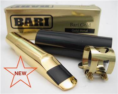 New Bari Gold Tenor Saxophone Mouthpiece. Marked 8* and tip opening measures .115. This is a new mouthpiece. Includes ligature, cap and original packaging.