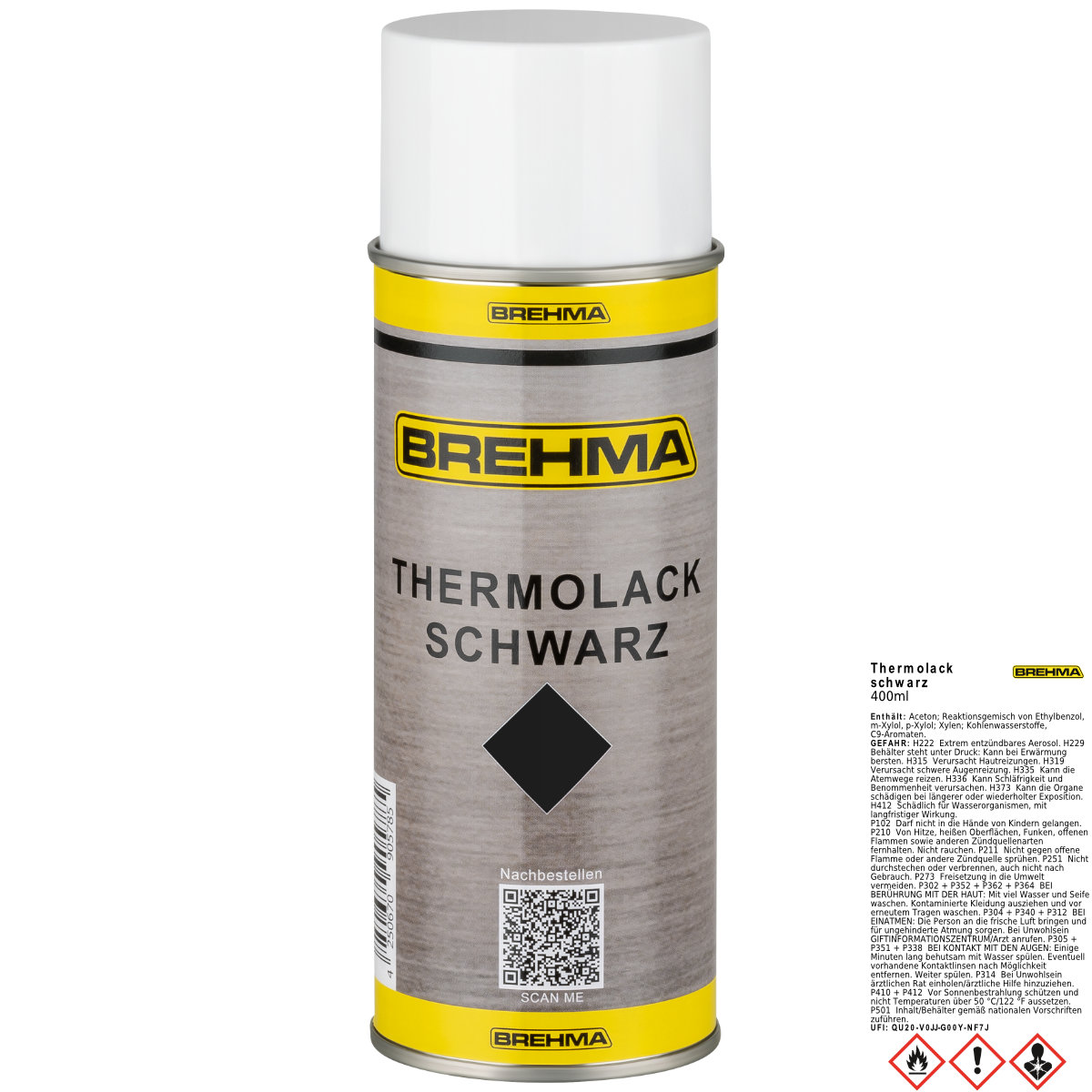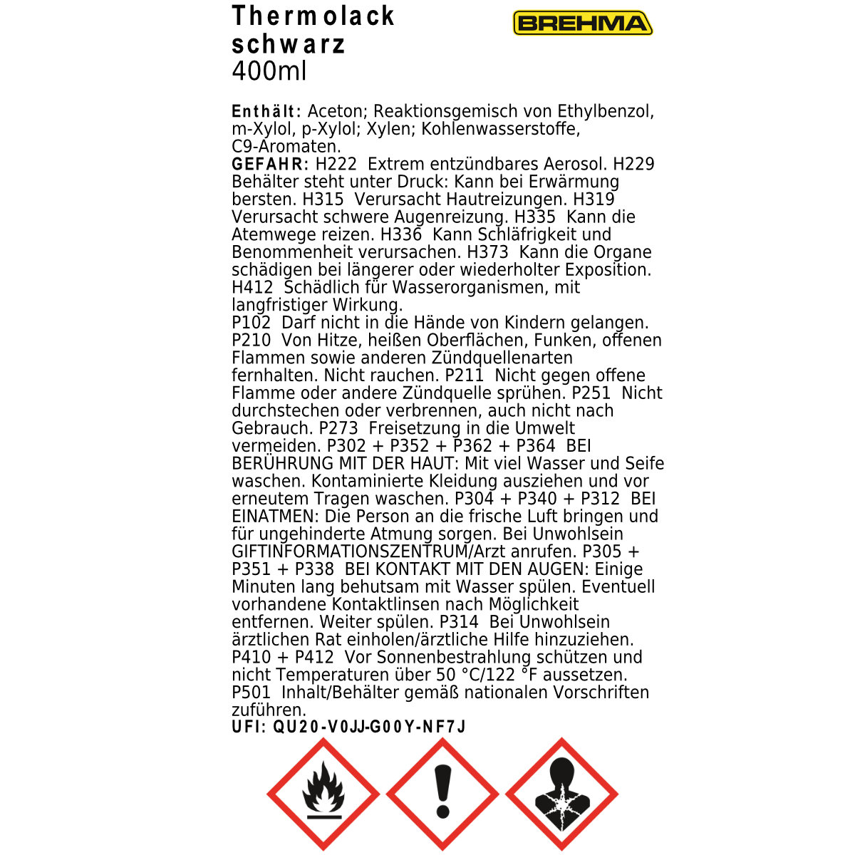 Die im BREHMA Thermolack Schwarz enthaltenen Lösungsmittel und Treibgase sind brennbar und in bestimmten Luftkonzentrationen explosiv.