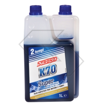 Aceite mezcla Strong K70 SUPER SINTÉTICO motor motosierra 2 tiempos Dispensador 1 LITRO Botella de 1 litro. Desarrollado para motores de 2 tiempos altamente estresados, El producto está formulado con ésteres sintéticos que garantizan un bajo ahumado. Excelentes características de resistencia a la carga y máximo desarrollo de la potencia del motor. Adecuado para: Motosierras, Desbrozadoras, Motocicletas, Scooters, Go-Karts