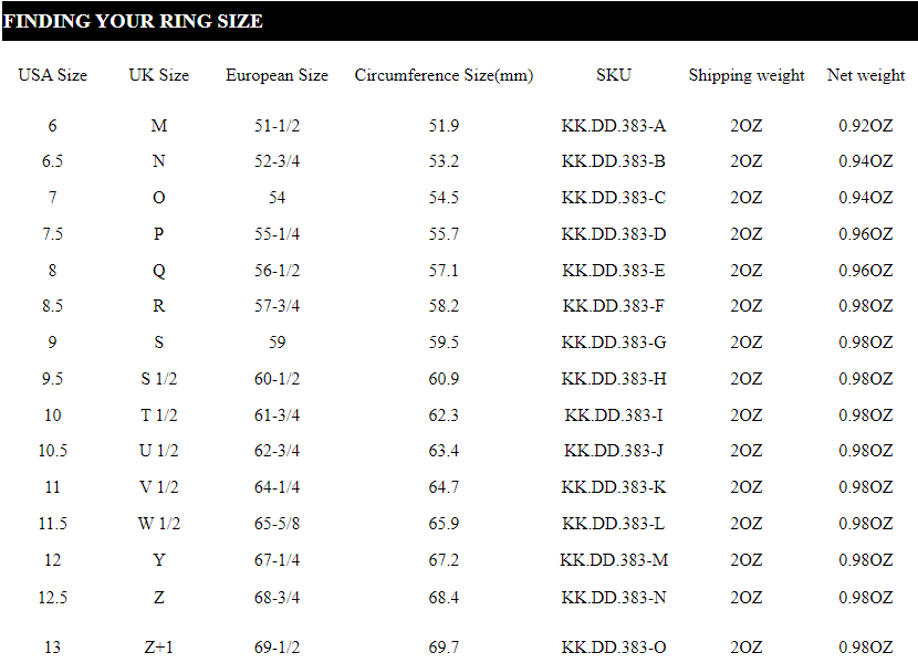 5.Locate the ring size by locating your measuring on the printed chart.If the measurement falls in between two size, it is recommended that you chose the large size.