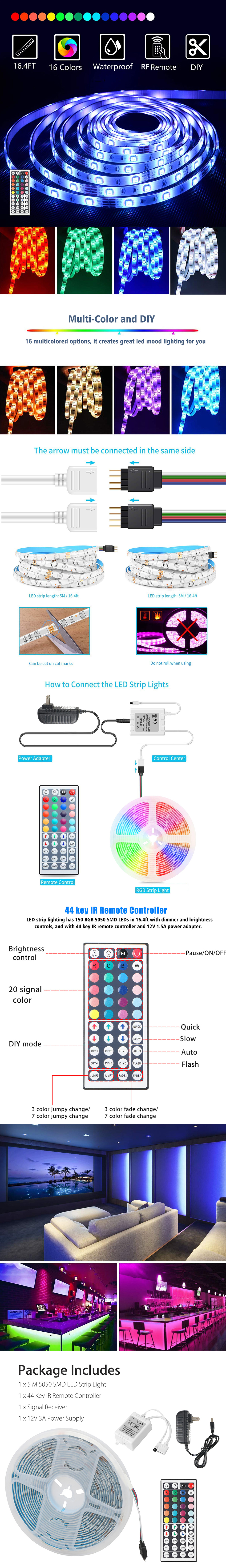 10M 32FT 3528 SMD RGB 600LEDs LED Light Strip+44Key Remote Control+12V US Power Product Features: Super bright:Use hight brightness superb SMD 3528 600LEDs type,high intensity and reliability LED light strip which gives a super bright light. Stable and safest:12V low working voltage durable power supply, more security and stabilty extremely low heat. It's can be change the color via the controller.3 colors option(Red,Green,Blue). Cuttable: Cuttable every 3 LEDs along the cutting marks, according to requirement. Environmental Friendly: Low carbon, no radiation, no flicker, and no pollution to human and environment. Other Functions: You can choose different colors, adjust brightness, turn On/Off, control modes: Flash, Strobe, Fade, RGB Smooth-change, Static as you like.Multi-Color LED Strip that can change color by using the remote controller.It has mutli colors. (Note: When displaying colors other than red, green and blue, the effect is not obvious,Under the adjustment of three single-color lamp beads, it is not a single lamp bead display) 8 light pattern: Quick/ Slow/ Auto/ Flash/ 3 color jumpy change/ 3 color fade change and R/G/B increase and decrease control. Applications: Ideal decoration choice for household lights DIY,stairs, trails,windows,Garden,swimming pool, party,disco,exhibition room, private club ,hotels,Theaters,shopping malls, bridge edge lighting,christmas trees,festivals and performances use.etc. Product Specification: Waterproof:IP65 -Waterproof TypeLED Strip Light LED Type 600pcs SMD 3528 LEDs Light ColorRGB (Red Green Blue) Viewing Angle120° Consumption2.4W/m with 900LM Size1000(L)x8(W)x2(W)cm Waterproof LevelIP65-Waterproof Input Voltage>DC12V Max Output Current2A/ each channel Control ModeIR Dimming ModePWM Output12V DC, 3 * 2 A Connect ModeCommon Anode Work Temperature-20~60 degree Input100-240V AC 50/60Hz OutputDC12V Max Current5A Connector5.5x2.1mm Max Wattage60W Package Includes: 2X 5 meters 3528 SMD RGB LED Strip Light(Waterproof) 1 x 44 Key IR Remote Controller (with battery) 1 x IR Controller 1 x 12v Power Supply |