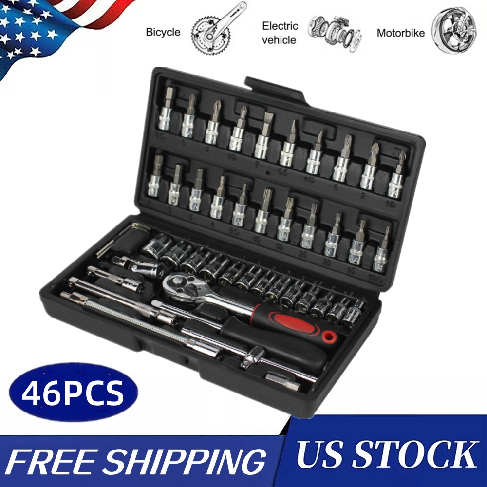 46PCS Ratchet Wrench Socket Set Spanner Tool Kit Metric / SAE 1/4" Drive w/ Case