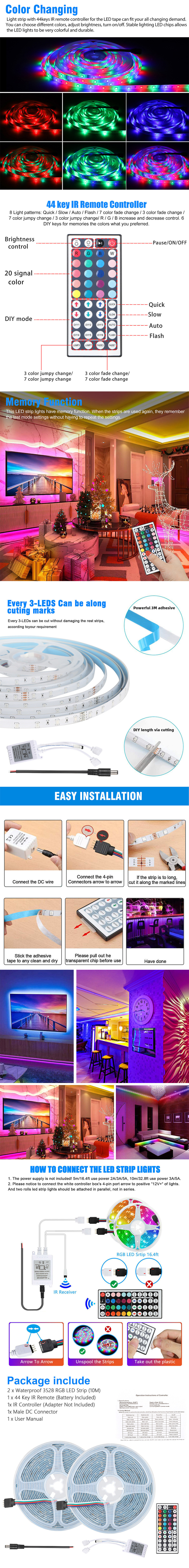 Color Changing: Light strip with 44keys IR remote controller for the LED tape can fit your all changing demand. You can choose different colors, adjust brightness, turn on/off. Stable lighting LED chips allows the LED lights to be very colorful and durable.