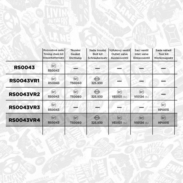 TIPP: Im Sortiment ET Engineteam haben wir auch folgende erweiterte Steuerkettensätze mit Inhalt Steuerkettensatz RS0043 und weitere ggf. notwendige Teile für die Reparatur. Unten eine Übersicht der Sätze mit deren Inhalt.