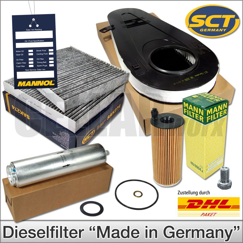 Inspektionskit BMW 5er F10 F11 F07 Passend für Motoren mit 1995 ccm: 5er F10/F11/F07: 518d 143 PS | 520d 163 PS + 184 PS | 525d 211 PS + 218 PS Lieferumfang: • 2 Filter im Originalkarton Motor-Luftfilter (SCT-Germany) • 100% passgenau Ölfilter (MANN-Filter) • 100% passgenau Dieselfilter / Kraftstofffilter (Topran-Germany) Ölablassschraube MANNOL Service-Anhänger Wir liefern hochwertige Markenfilter
