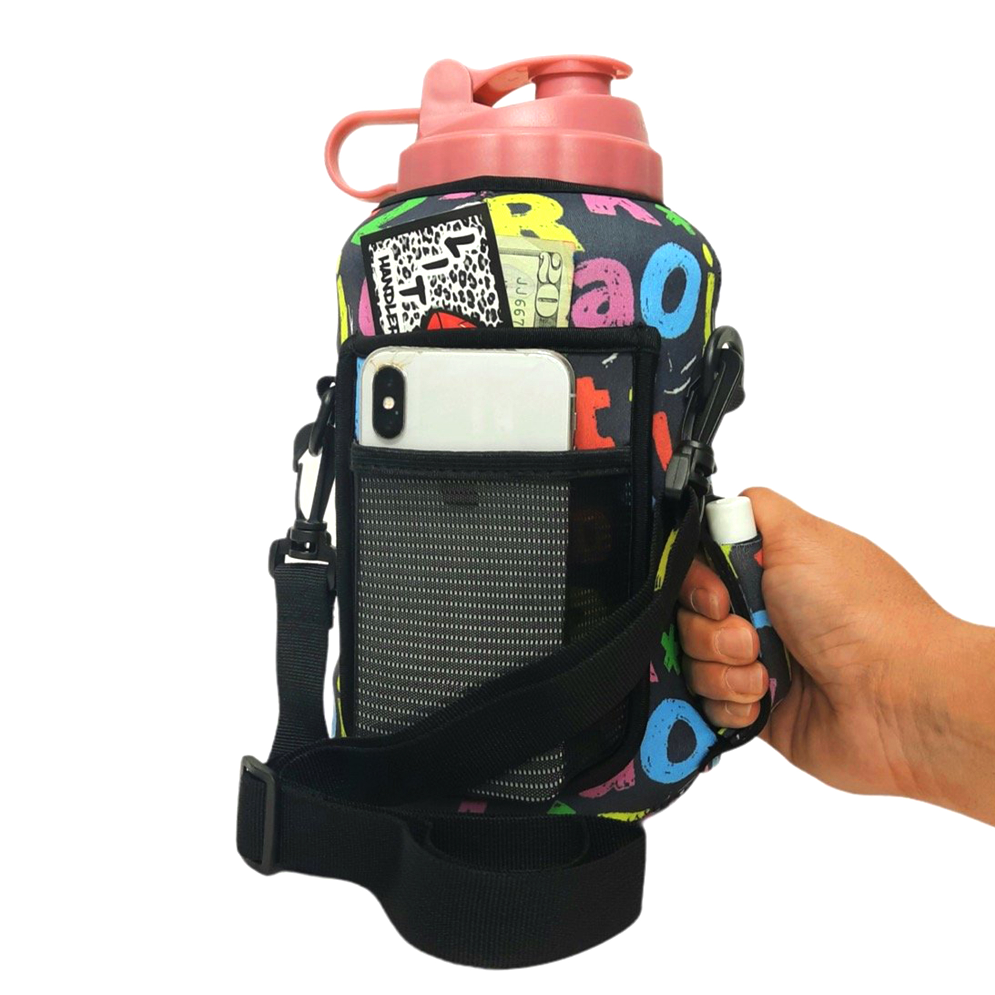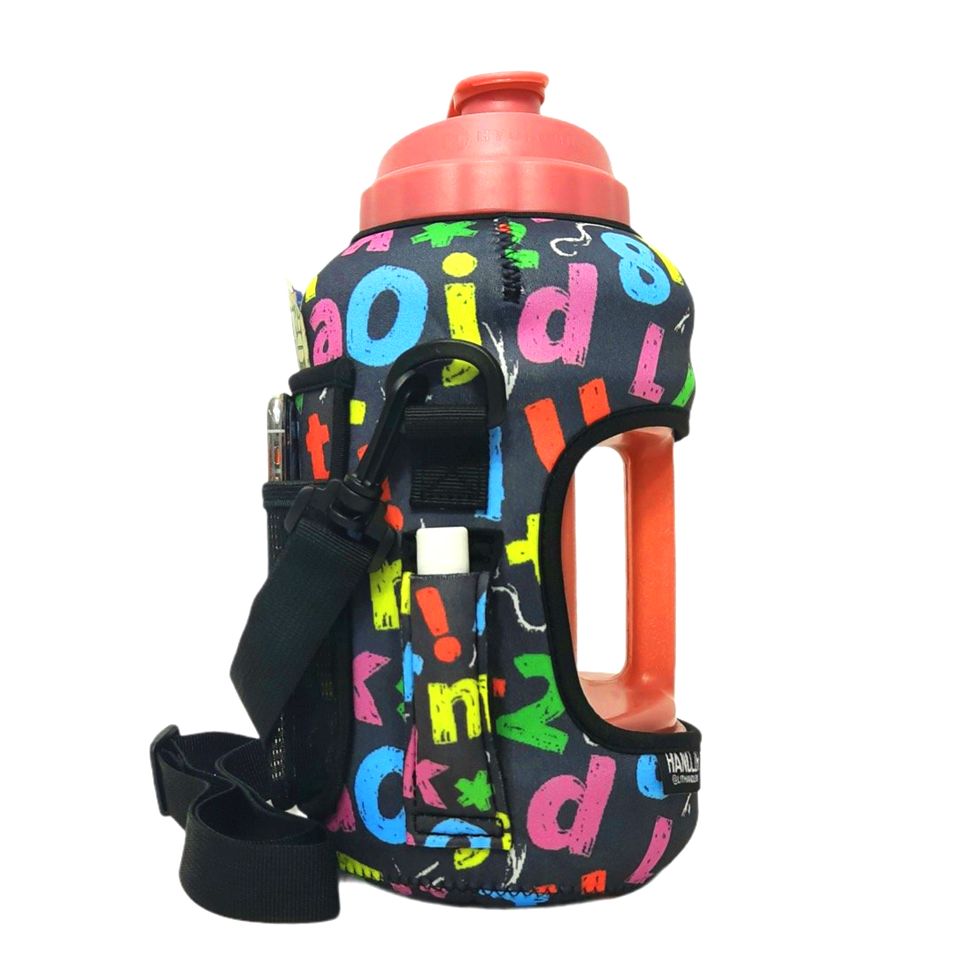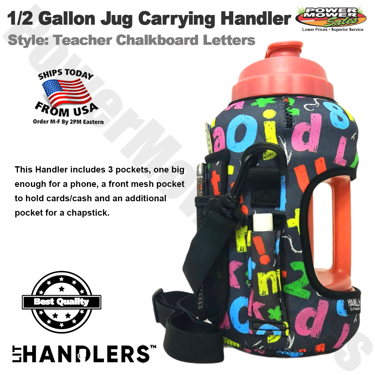 Lit Handlers 1/2 Gallon Jug - Teacher Chalkboard Letters Design - Neoprene Insulating Sleeve w/ Detachable Shoulder Strap, 3 pockets, including one mesh pocket for cards/cash & one for chapstick