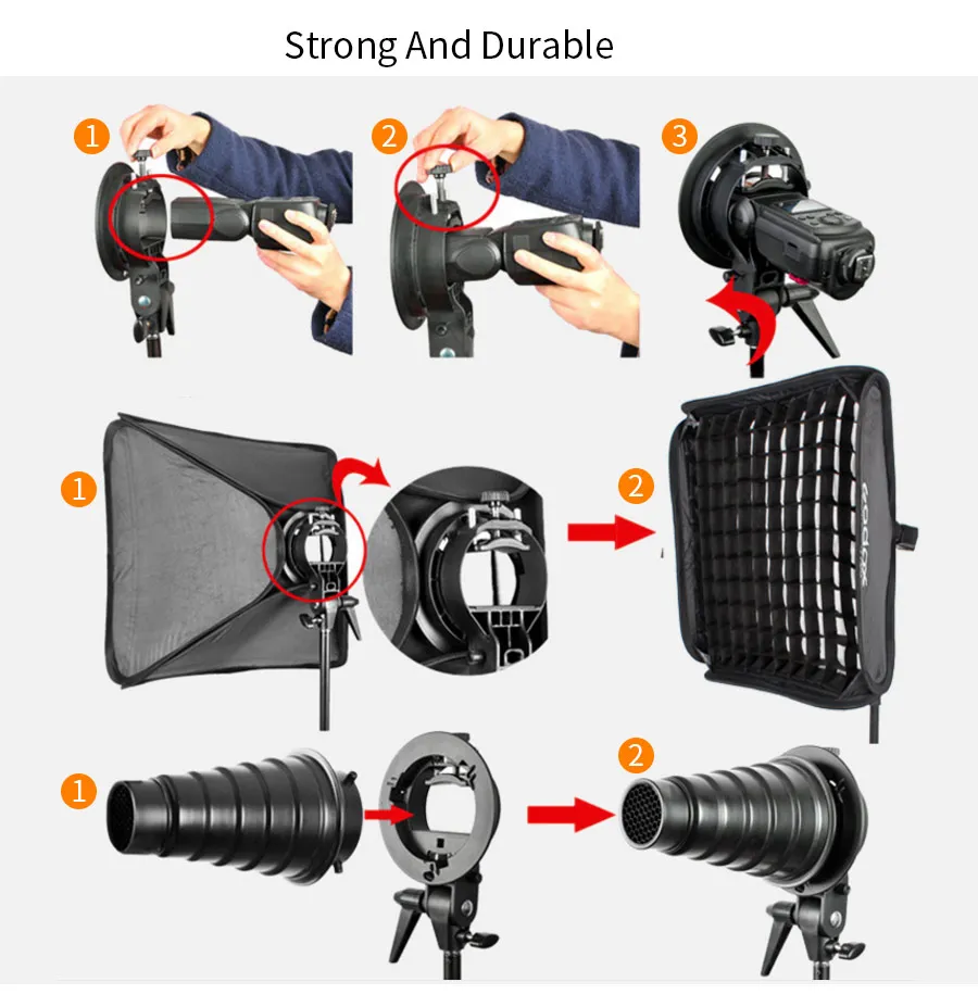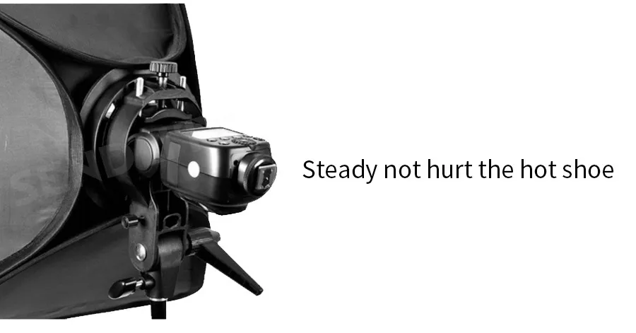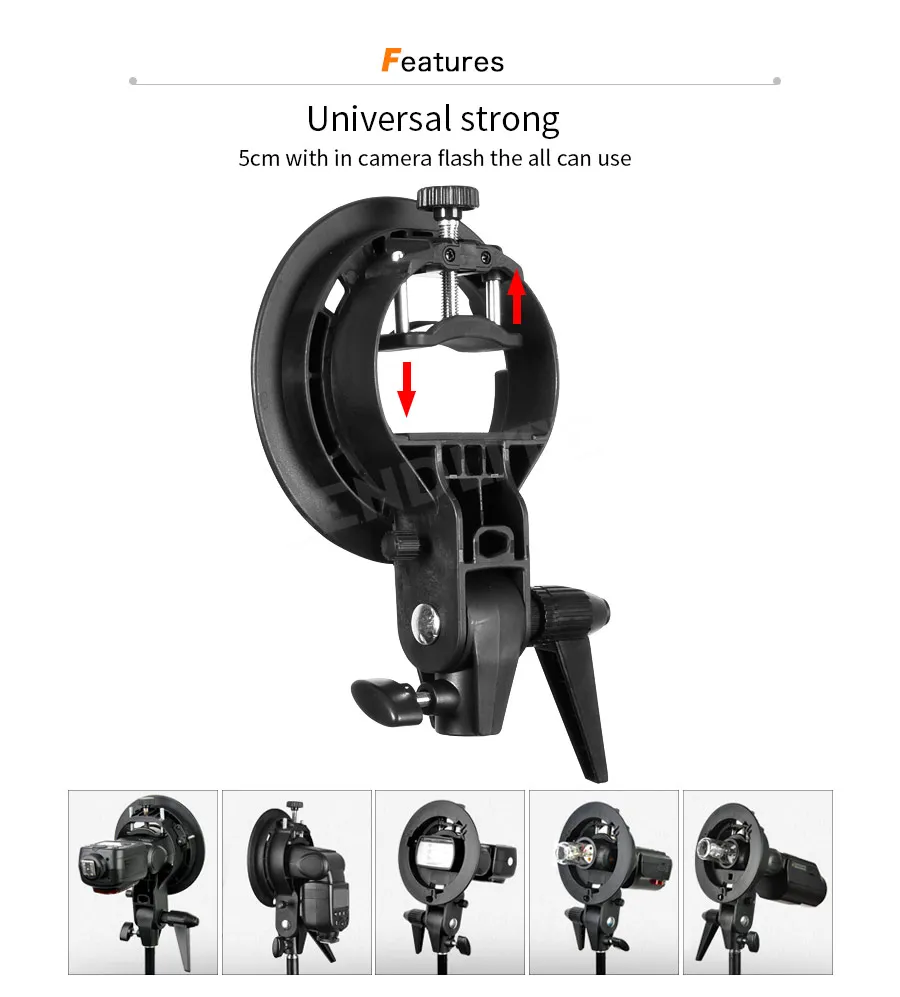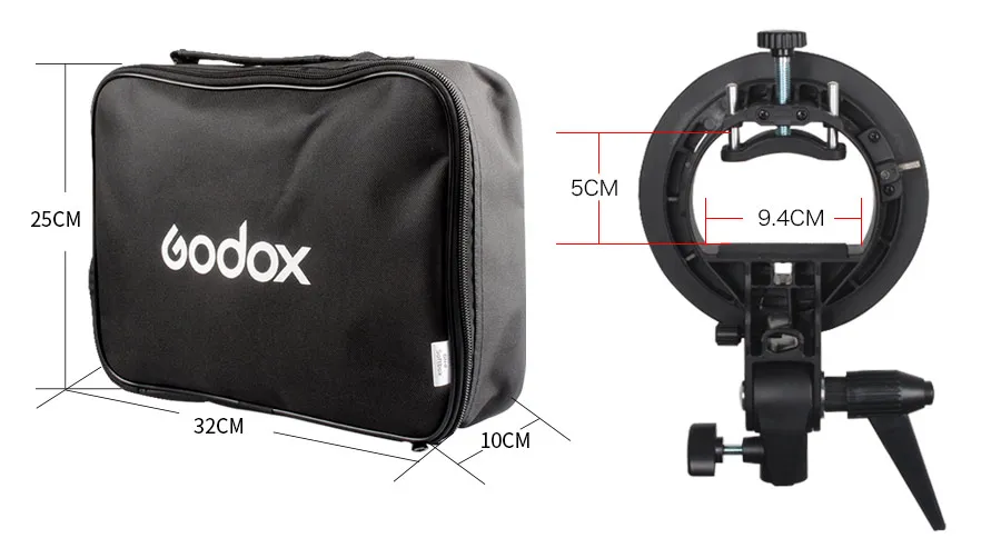 Specifications: Godox S-Type Speedlite Bracket: - Model: S-type - Structure: Compressed and flat structure takes up little space. - Mounting Method: peedlite body is hold and fixed by a big mount, which provides a stable and secure support. - Installation: No pre-assembly and post-disassembly. - Functions: With Bowens-mount, Speed ring, Umbrella input, Direction-adjustable handle, Horizontally-movable ability. - Material: Durable plastics - Dimension (L x W x H): Approx. 15×5.5×22cm - Weight: Approx. 410g 40x40cm Speedlite Foldable Softbox: - Size: 40x40cm - Light Weight & easy to set up - Provides Greater Light that is very even - No Hot Spots or Concentric Circles - Silver reflective internal face and Black back side - Outer and inner soft diffuser included
