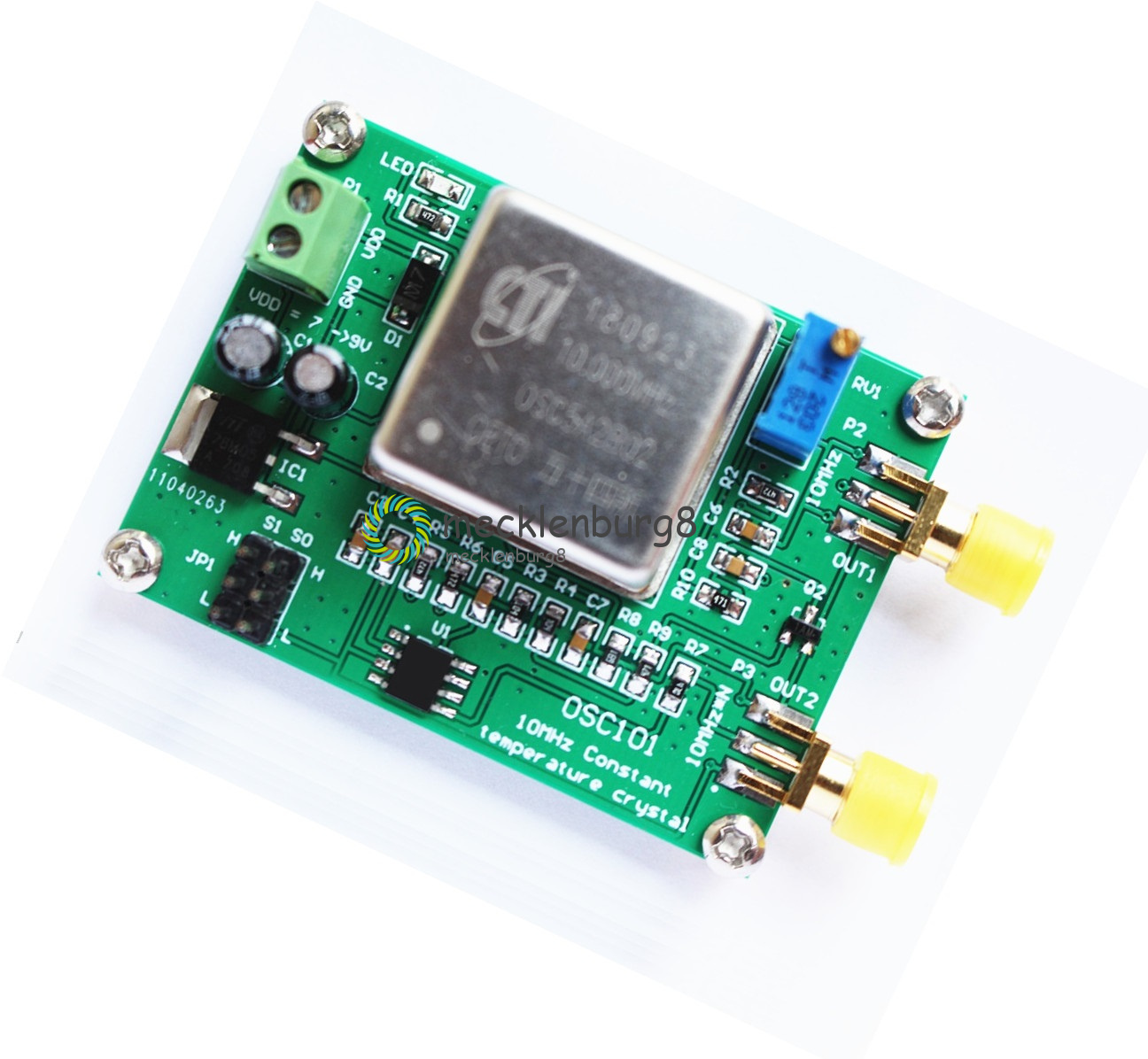 The different multipliers are selected by the JP1 jumper pin. Correct the deviation of the 10Mhz output frequency (+/-2.0ppm) with the RV1 potentiometer.