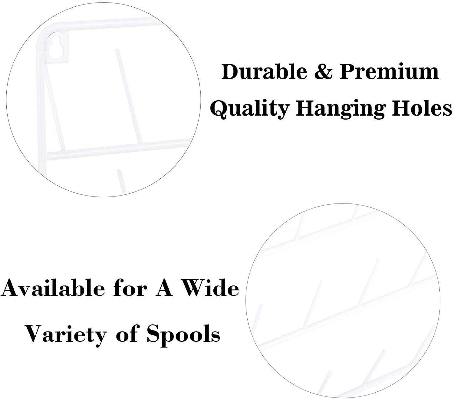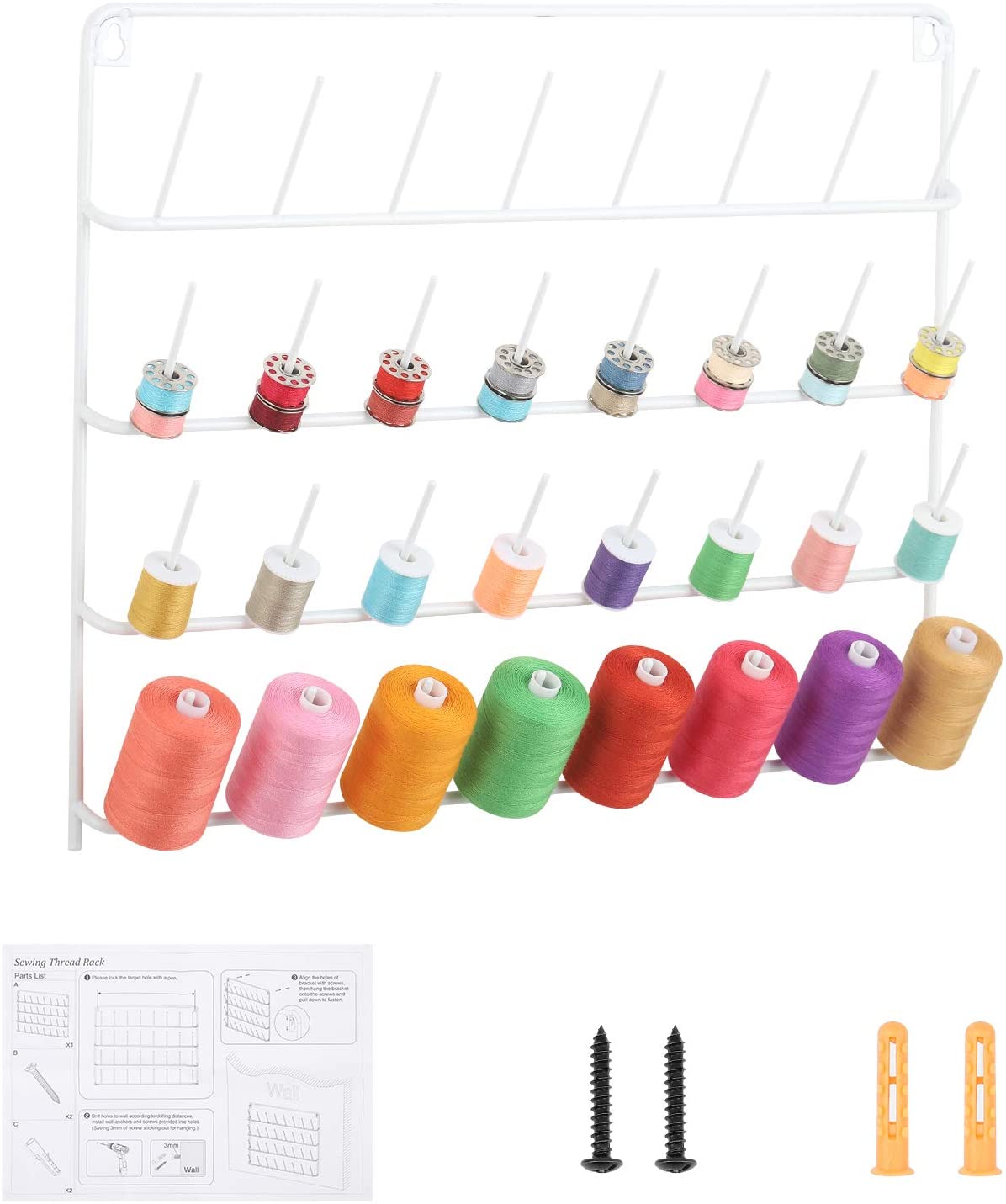 ⭐【Include Wall Hanging Hole & Accessories】 There are 2 plastic anchors, 2 Screw, 3 Sticker and 1 screwdriver in package, and the 2 wall hanging hole are in the back of the metal thread rack, which you can use them to directly mount the spool organizer to the wall without worrying to look for the accessories when receive the thread spool holder.