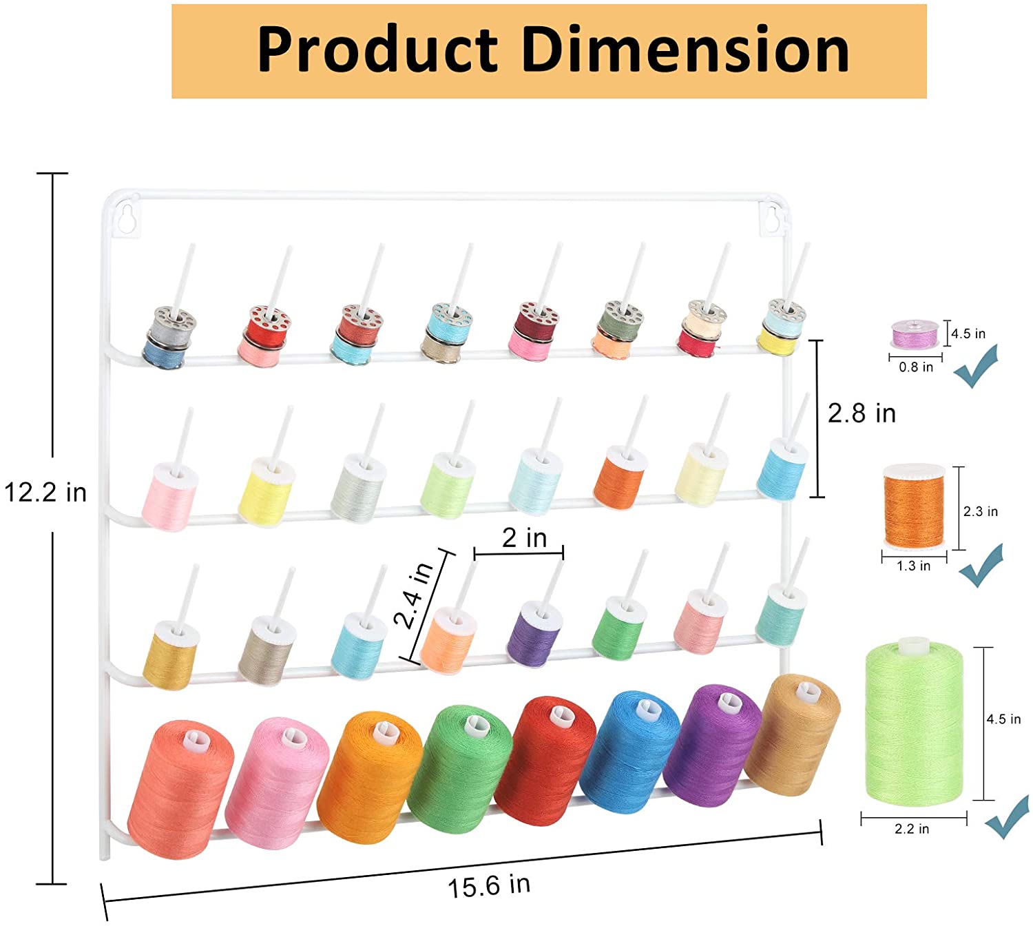 ⭐【Pefect Size of Metal Thread Rack】The size of rack is 15.6” x 12.2” The sewing organizer with 32 -spool thread rack, and the space between the spool is 2inch, pegs are 2.4" tall. It could work well to organize many small & medium& big thread spools and cones.