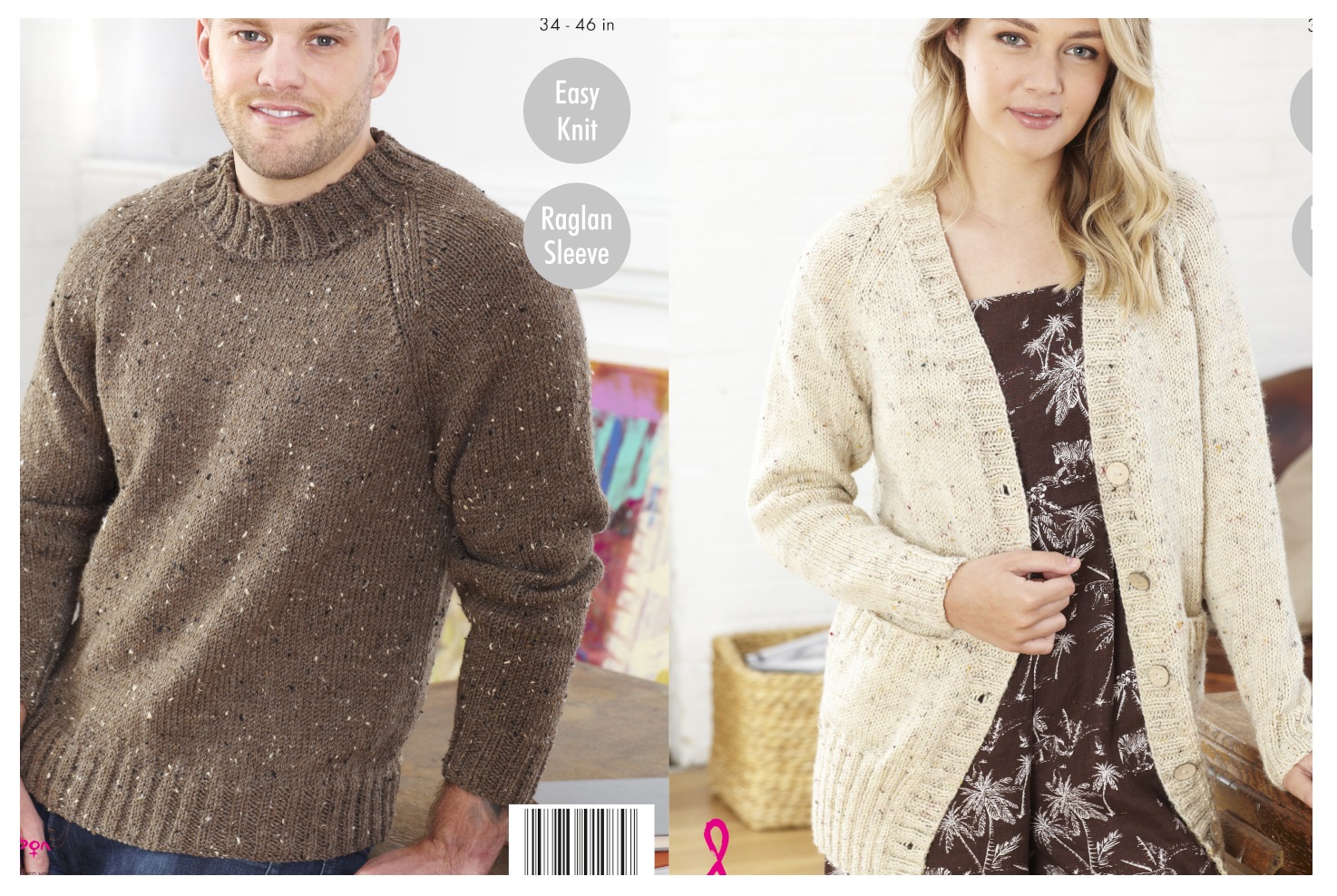 This easy knit aran knitting pattern leaflet 5543 by King Cole will instruct you on how to create a raglan sleeve sweater and cardigan, suitable for women and men.