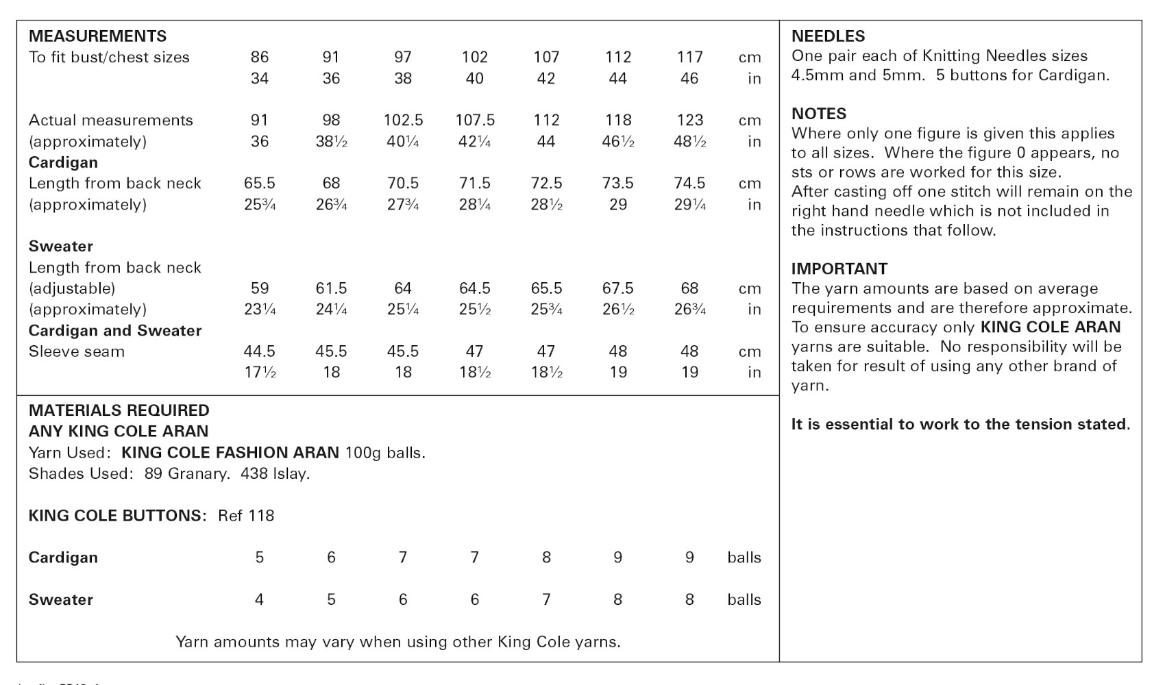 This King Cole knitting pattern is suitable for use with most aran yarns, however tensions may vary and we recommend you knit a tension square before knitting the whole garment.