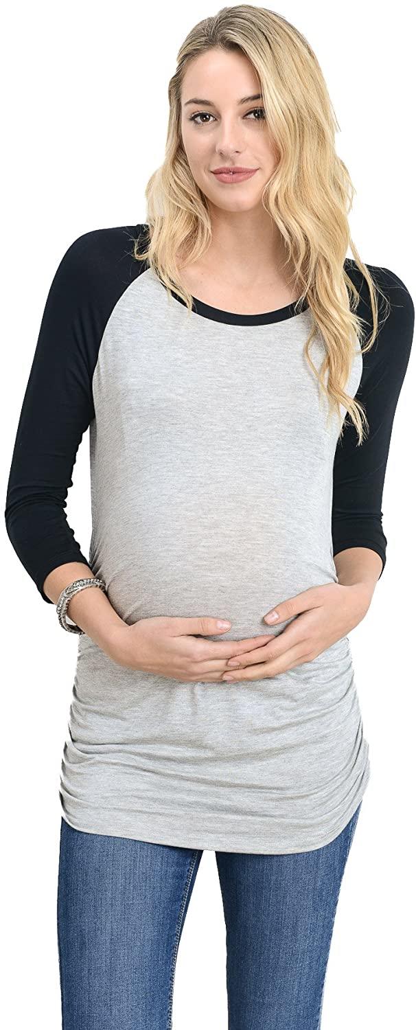 LaClef Maternity T-Shirt Top with Baseball Raglan, Heather Grey/Black, Large