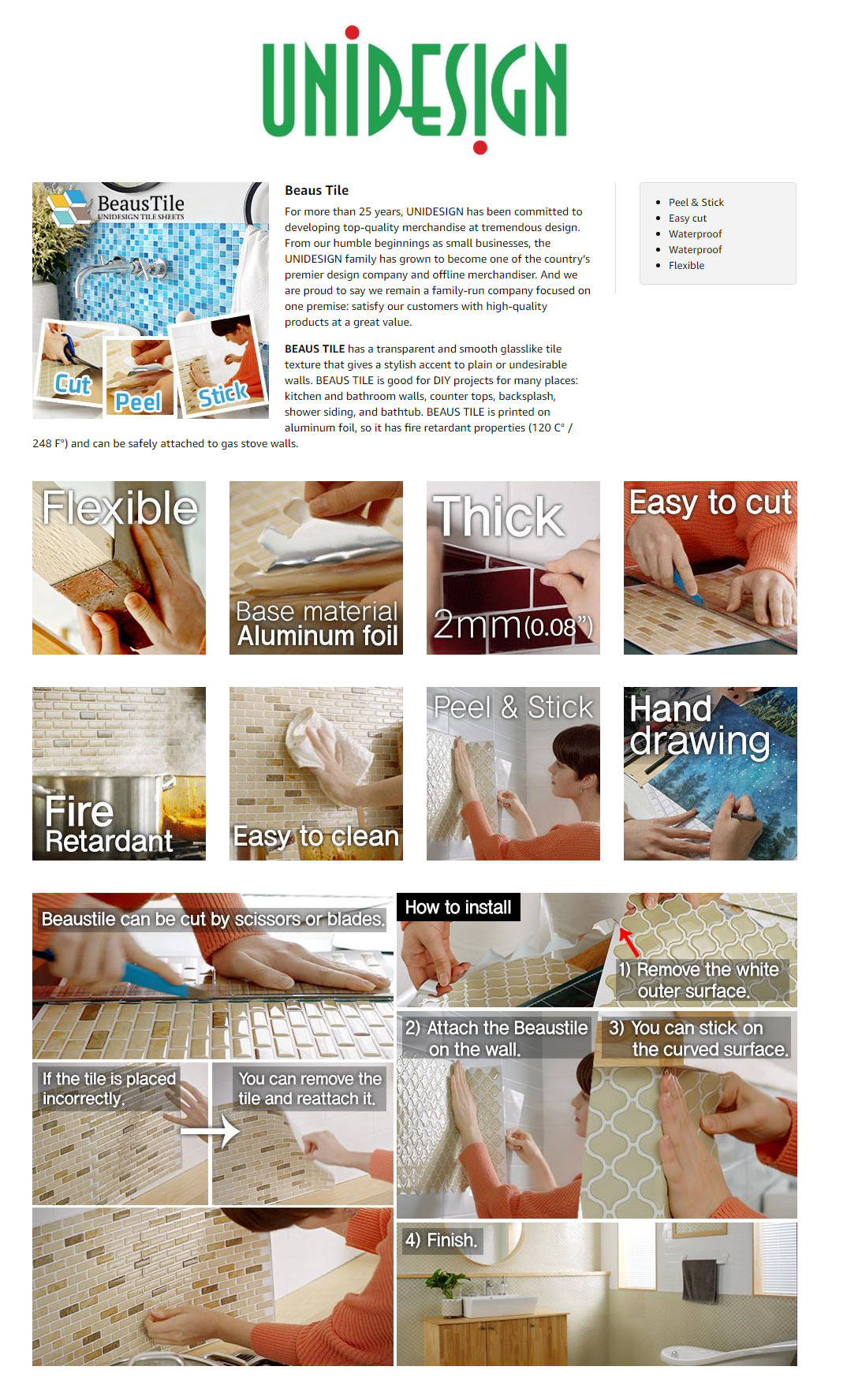 to the gas stove wall for safety. Because we printed the pattern directly on the aluminum foil surface, the product can withstand up to 120 Celsius degrees. BEAUSTile is easy to apply to all