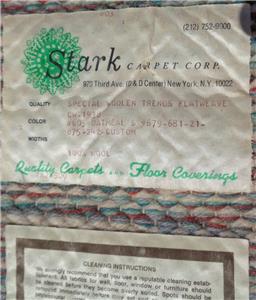 Offered here is this Vintage Stark Carpet Corp. Special Woolen Trends Flatweave #605 Area Rug. It is in good condition, with no holes or tears, but the rug absolutely will need to be cleaned before use. It is the Oatmeal color and is design number 605. It is a flat weave rug and is made of 100% wool. The rug does NOT include a pad. It is a custom-made rug, and I believe that it dates to 1938. The rug is 103.5” wide, and 174.5” long. It is a nice, extra large size flat weave wool rug that when cleaned will be an amazing accent piece in your room.