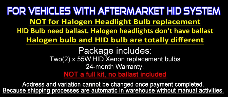 🚫【Compatibility】NOT FOR Halogen bulbs replacement! HID bulbs need ballasts. Halogen headlight DON'T have ballast! Please note these replacement bulbs are only suitable for vehicles equipped with aftermarket HID conversion kit. Please check your car’s stock bulb and make sure it is suitable for installation. MAKE SURE IT FITS.