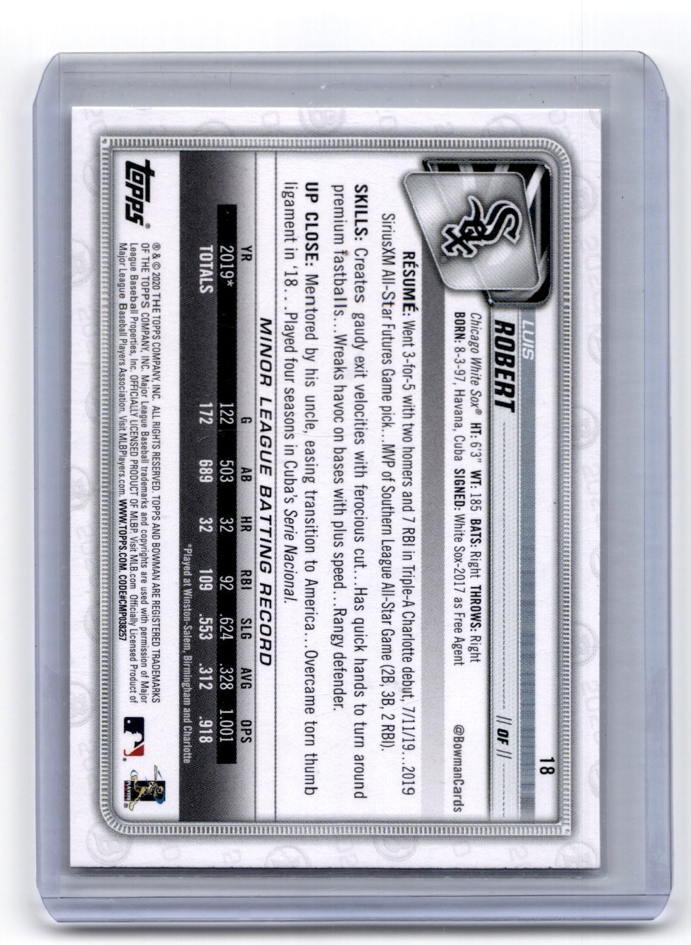 | Description: | Luis Robert | | Category: | Baseball | | Year: | 2020 | | Product: | Bowman | | Team: | Chicago White Sox | | Card Number: | 18 | | Rookie: | Yes | | Dimensions: | 4¼" x 3" |