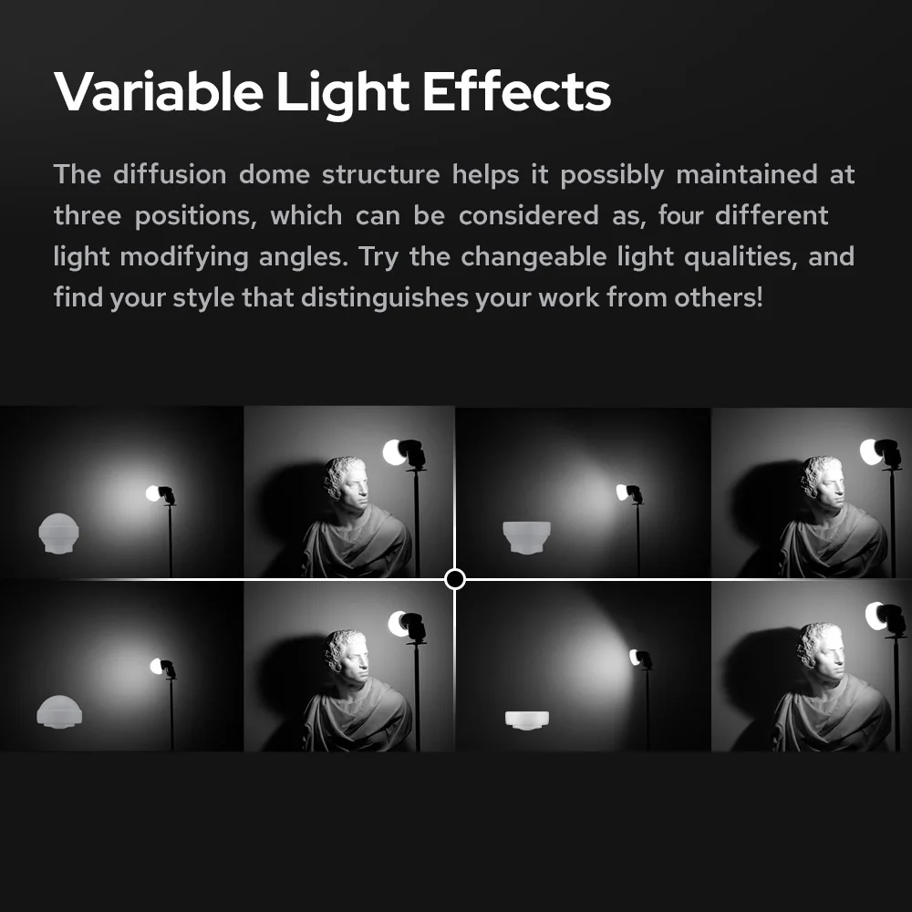 [Collapsible Diffusion Dome] Offering variable shapes for light shaping, providing 3 different light modifying angles, making your masterpiece distinguish from others!
