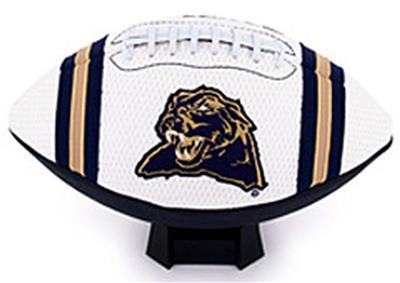 The 'Jersey' full size football features the same white mesh worn on the playing field. The team color pebble compliments the uniform-quality embroidered patches and collegiate stripes. Makes a great gift for your favorite sports fan!. Made By Jarden.