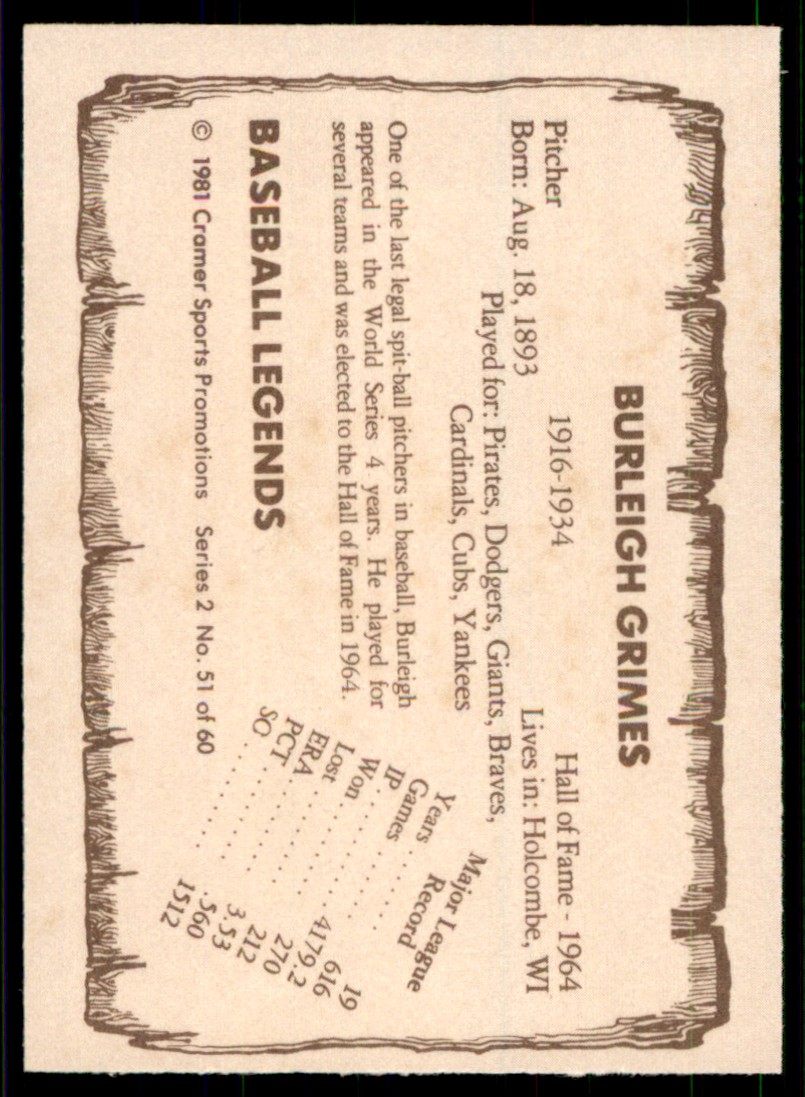 | 1981 Cramer Baseball Legends Series 2 51 Burleigh Grimes |