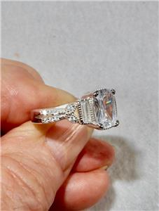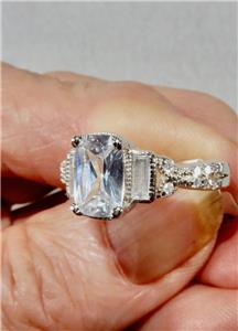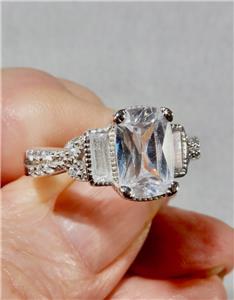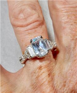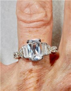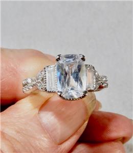 This gorgeous sparkly 3-stone cubic zirconia ring is made of 925 sterling silver. The center stone is emerald cut and measures 6 x 9 mm, and there is a baguette on each side. It is a size 8.