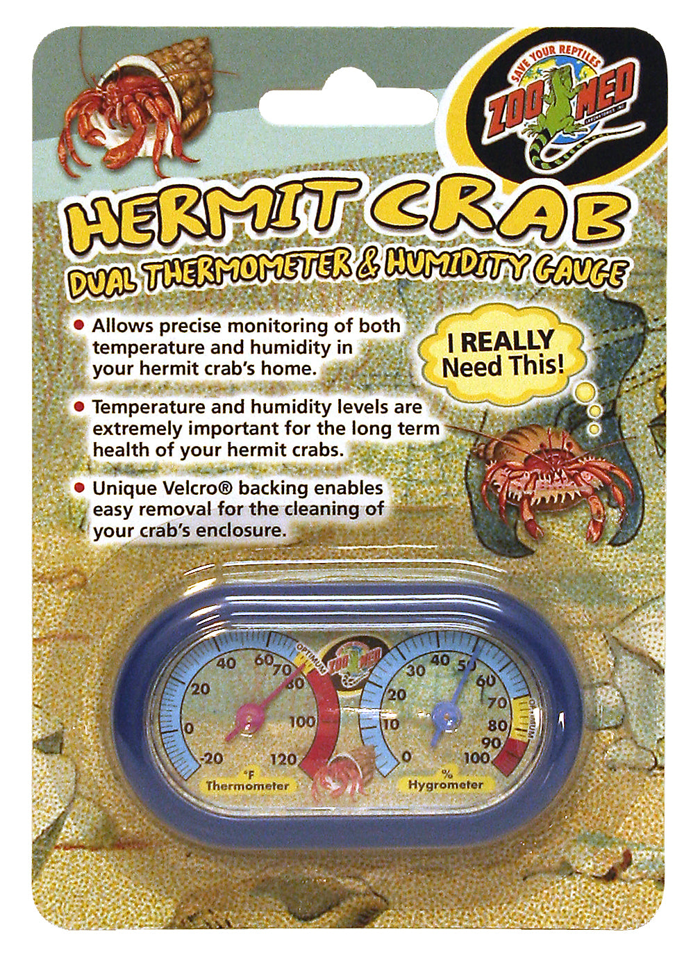 Allows precise monitoring of both temperature and humidity in your Hermit Crab's home. Temperature and humidity levels are vital for the long-term health of your Hermit Crabs. Maintaining proper temperature and humidity levels will allow your Hermit Crabs to properly digest and metabolize food and facilitate shedding (molting). This will help decrease stress levels and prevent against possible illness and disease. Unique hook and loop backing enables easy removal for the cleaning of your crab's enclosure.