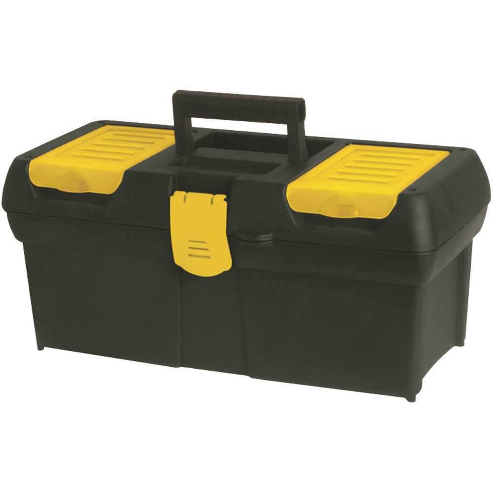 The STANLEY 16 in portable plastic tool box has many convenient features that make it easy to store, access, organize and transport tools and parts. This lockable tool box has a 2.1 gal storage capacity and features a removable tray and two lid organizers.