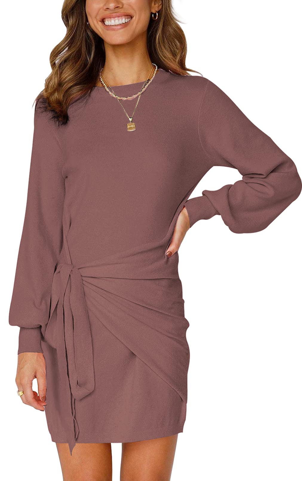 Our basic knit pullover sweater short dress is a thoughtful piece for the holiday season. Lightweight and stretchy casual wrap dress, classic solid color, crew neck, above knee length. Features lantern long sleeves and tie waist at the front, can hide the belly and arms, show your great slim fit. Suitable for most lady's body shape.