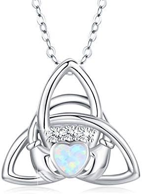 Celtic Knot Necklace, Synthetic Opal Trinity Necklace S925 Sterling Silver Kelly Hands Holding Crown Heart Necklace Good Luck Irish Claddagh Pendant Mother's Day Gift for Women