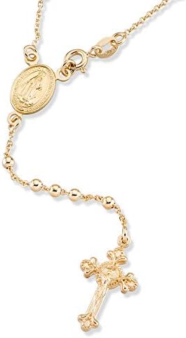 - SPIRITUALLY SYMBOLIC - Wear your faith with this classic Italian crafted 18K yellow gold over sterling silver 20" rosary bead ball station Y necklace featuring a Miraculous Medal of the Virgin Mary and polished cross pendant that dangles from a 3” drop. This timeless elegant chain can be worn as a religious symbol or as an everyday cool fashion statement. Looks equally beautiful with casual jeans and t-shirt as it does with a more formal, dressy attire.