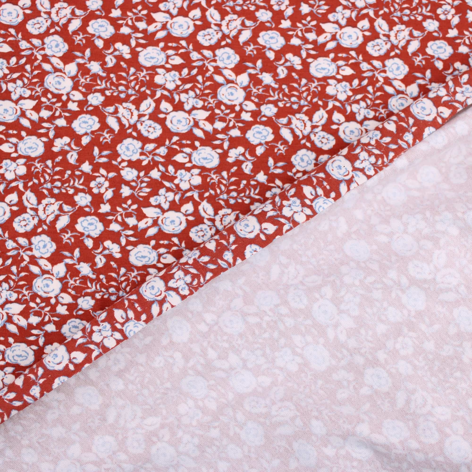 Digitally printed, this medium-weight bamboo cotton jersey fabric is an OEKO-TEX material. With a design of a floral print of roses on a dark red background scattered tightly all over the material.