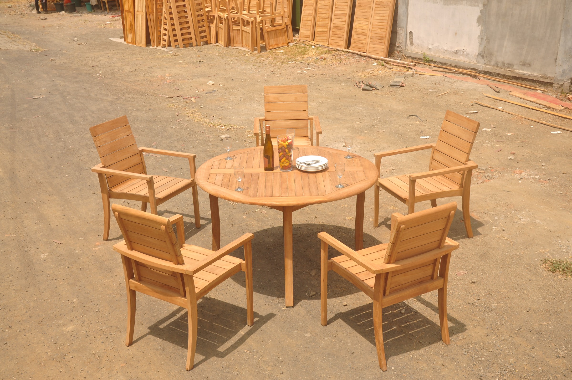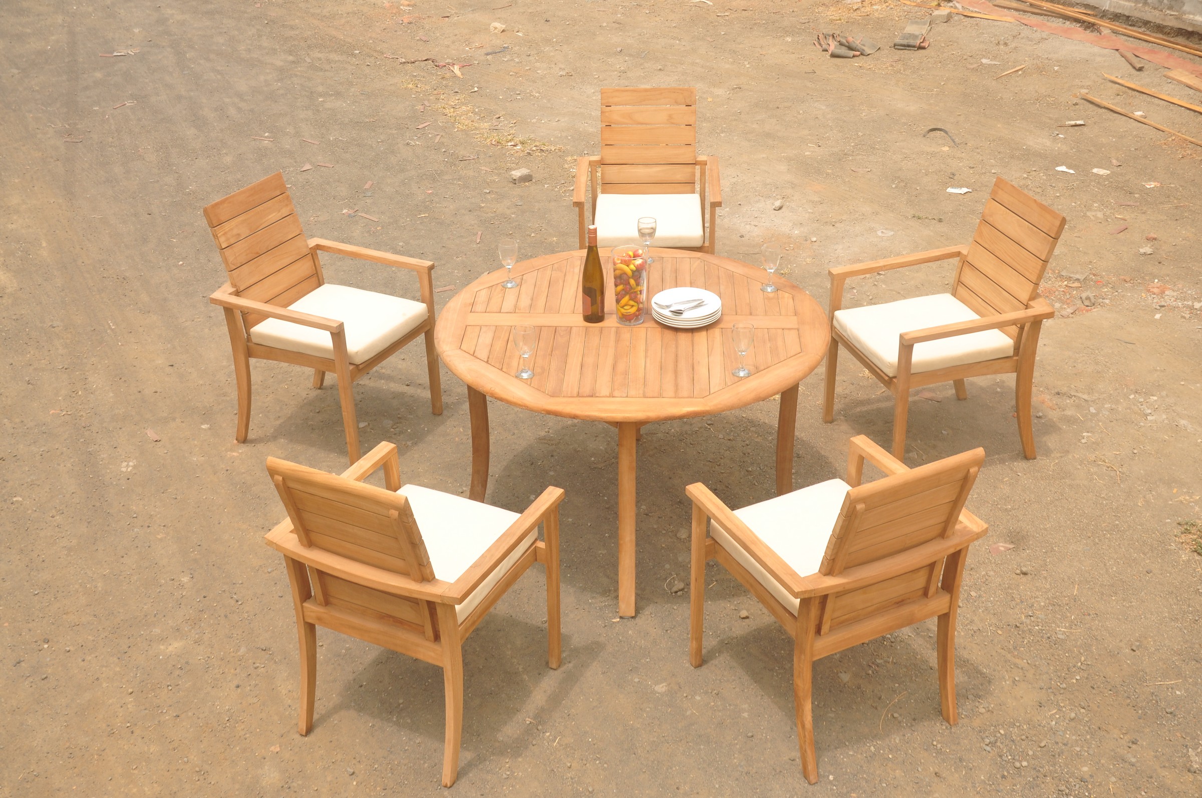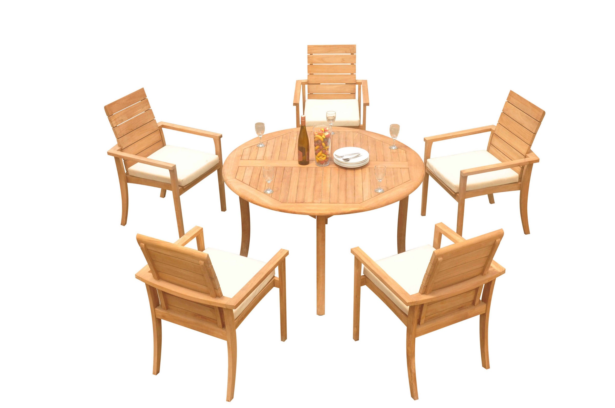 Set includes: 52" Round Table and 5 Algrave Stacking Arm Chairs. Pictures shown with more chairs is for illustration purpose only. You will receive only 5 chairs. ** Wood Umbrella Hole Plug is also provided. ** 2" Umbrella Hole is available in the middle of the table. ** Umbrella is not included with the set, but can be purchase separately, please inquire. ** DON'T FORGET TO ENQUIRE ABOUT OUR SUNBRELA CUSHIONS (SOLD SEPARATELY) ** If you need more chairs, please let us know. ** Assembly: Very little assembly is required. This furniture will be delivered in partially assembled sections. Assembly is quick and simple. **Accessories shown in picture are not included with the set. Please inquire if you are interested.