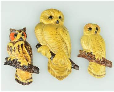 Offered for Sale are these Beautiful Artist Hand Painted Lay Flat Owl Figurines (3). The back of two of the Owls say Snowy Owl. The third is marked Great Horned Owl and also has the words Trailside Museum, River Forest Ill. These Owls were part of a large collection of ceramic (I believe the material is ceramic) figurines that were painted and displayed in a shadow box. Unfortunately the box and some of the figurines were damaged. To save the remaining figurines, they had to be removed from the felt display material. For that reason you may see some glue remnants on the back of the figurine.